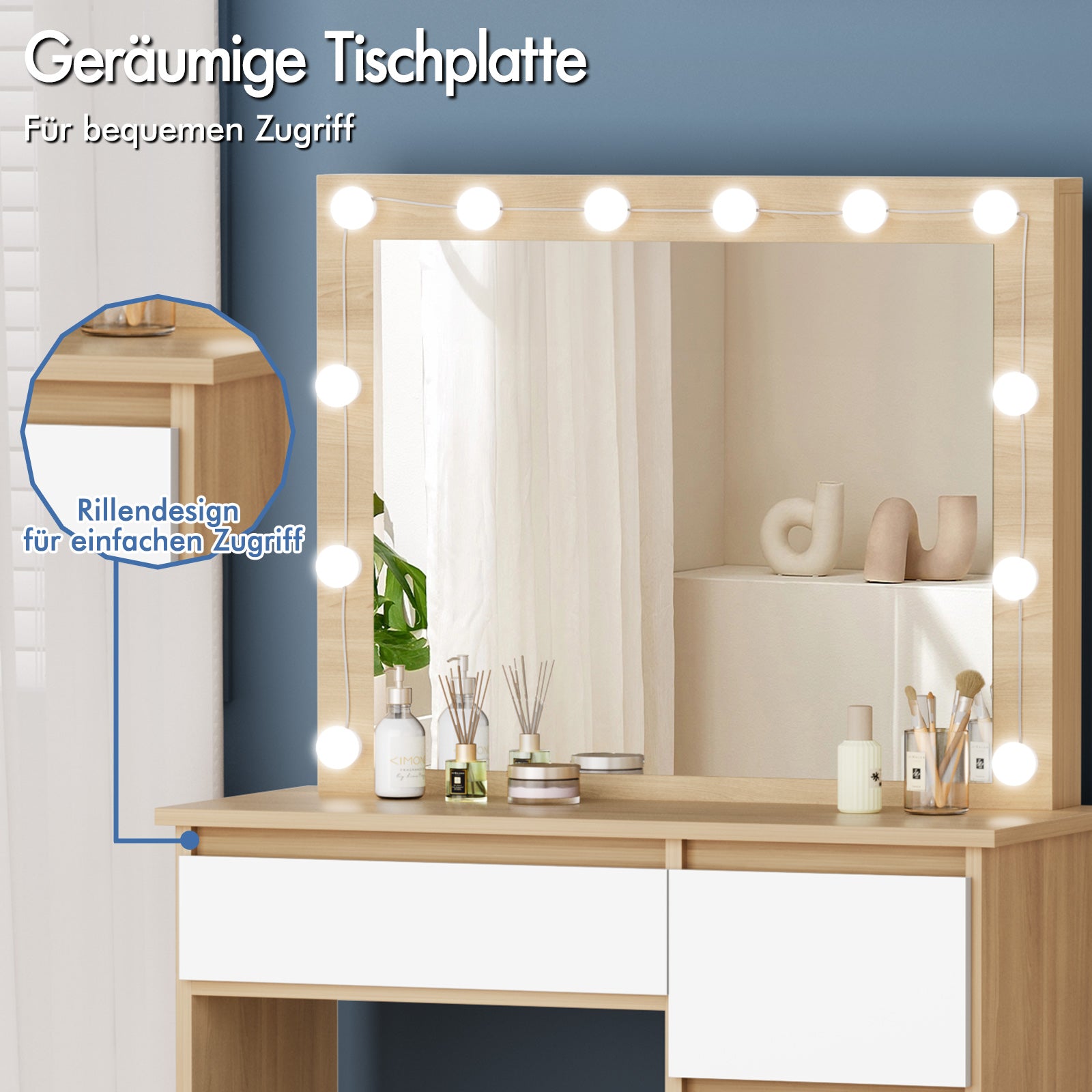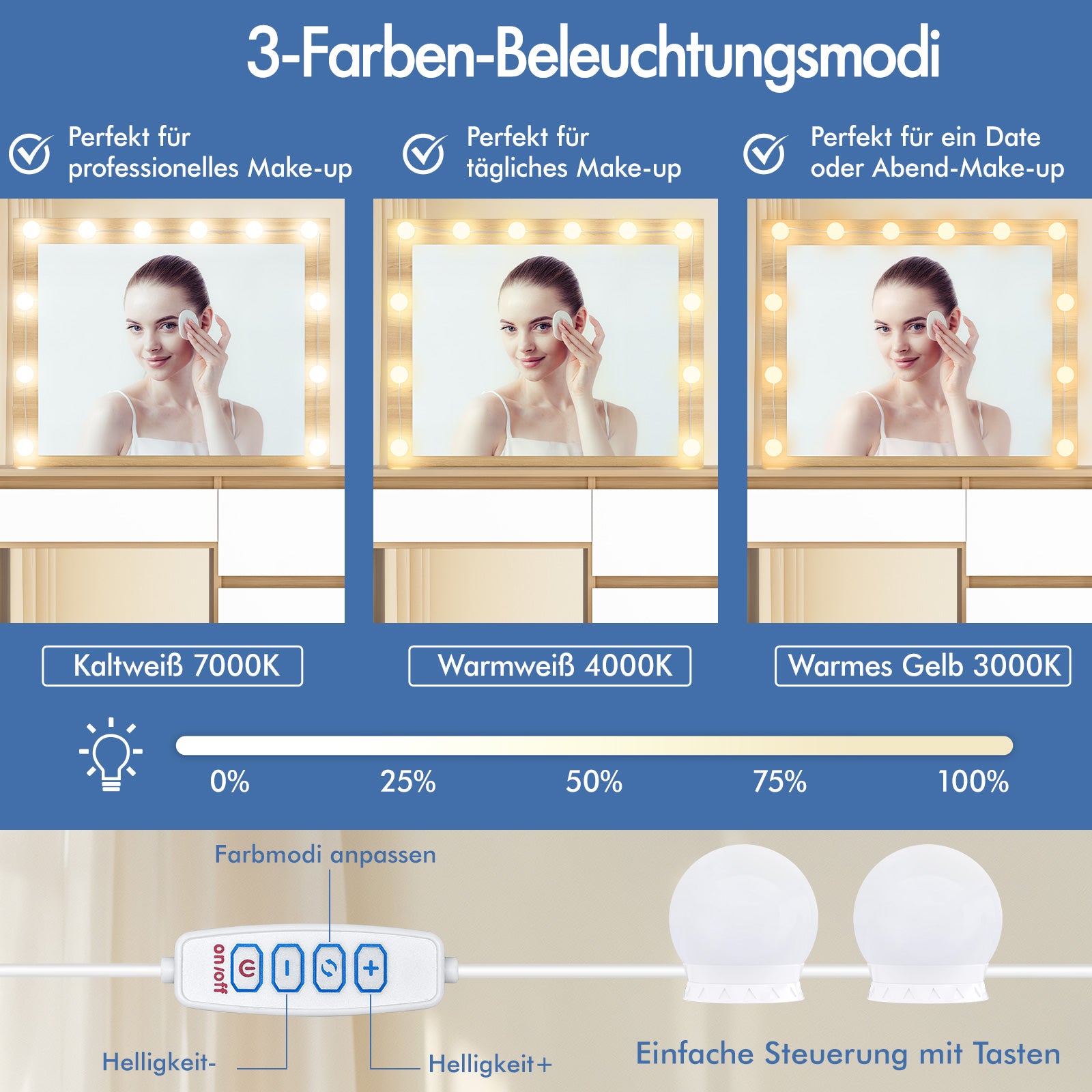 Anpassbare Beleuchtung – Gute Beleuchtung ist wichtig für Ihren perfekten Glamour-Look. Der Schminktisch verfügt über 3 LED-Lichtfarben – Neutralweiß, Warmweiß und Tageslichtweiß – und sorgt so für ausreichend Licht für Ihr Make-up.