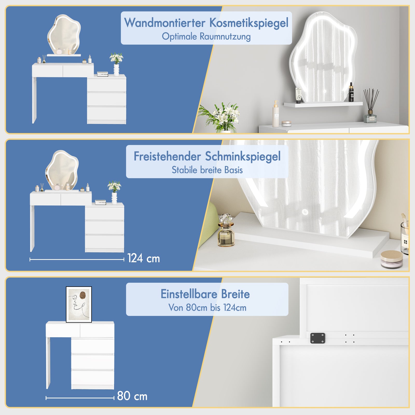 Verstellbarer Seitenschrank – Der Schminktisch mit seinem kompakten und flexiblen Design verfügt über eine bewegliche Kommode mit drei Schubladen, die links oder rechts angebracht werden kann, um Ihren unterschiedlichen Platzierungsanforderungen gerecht zu werden. Besonders hervorzuheben ist, dass die Breite von 80 cm bis 124 cm verstellbar ist und sich um 90 Grad drehen lässt, um in jede Ecke zu passen. So lässt sich der Platz optimal nutzen.