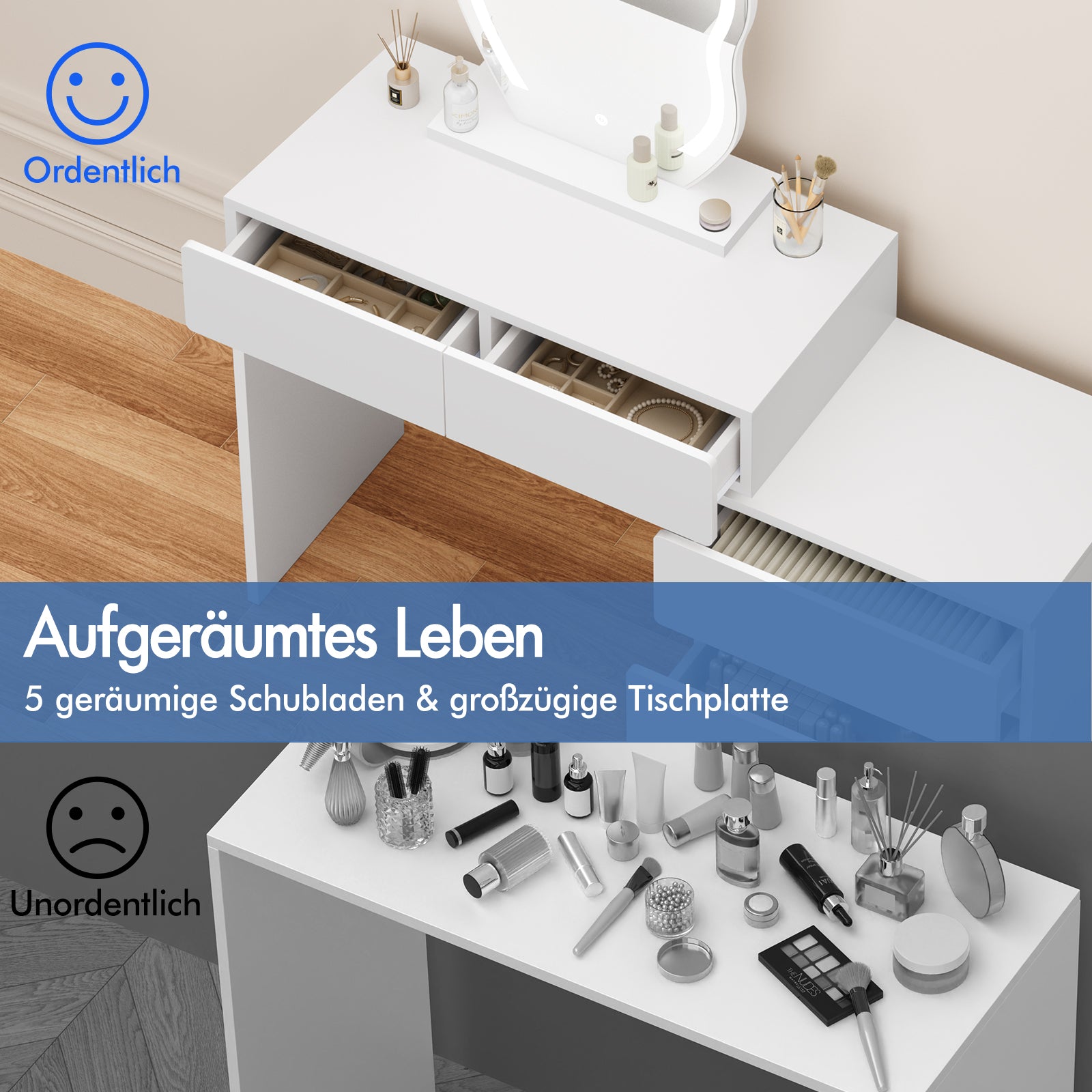 Halten Sie Ihre Sachen organisiert – Es verfügt über vier Schubladen in verschiedenen Größen für verschiedene Aufbewahrungsmöglichkeiten. Gegenstände, auf die Sie schnell zugreifen möchten, wie Make-up-Produkte, Lotionen oder Parfüms, können Sie einfach auf der Schreibtischplatte oder dem Tisch ablegen. Andere Gegenstände, wie Schmuck, können Sie in Schubladen verstauen, damit sie nicht verstauben.