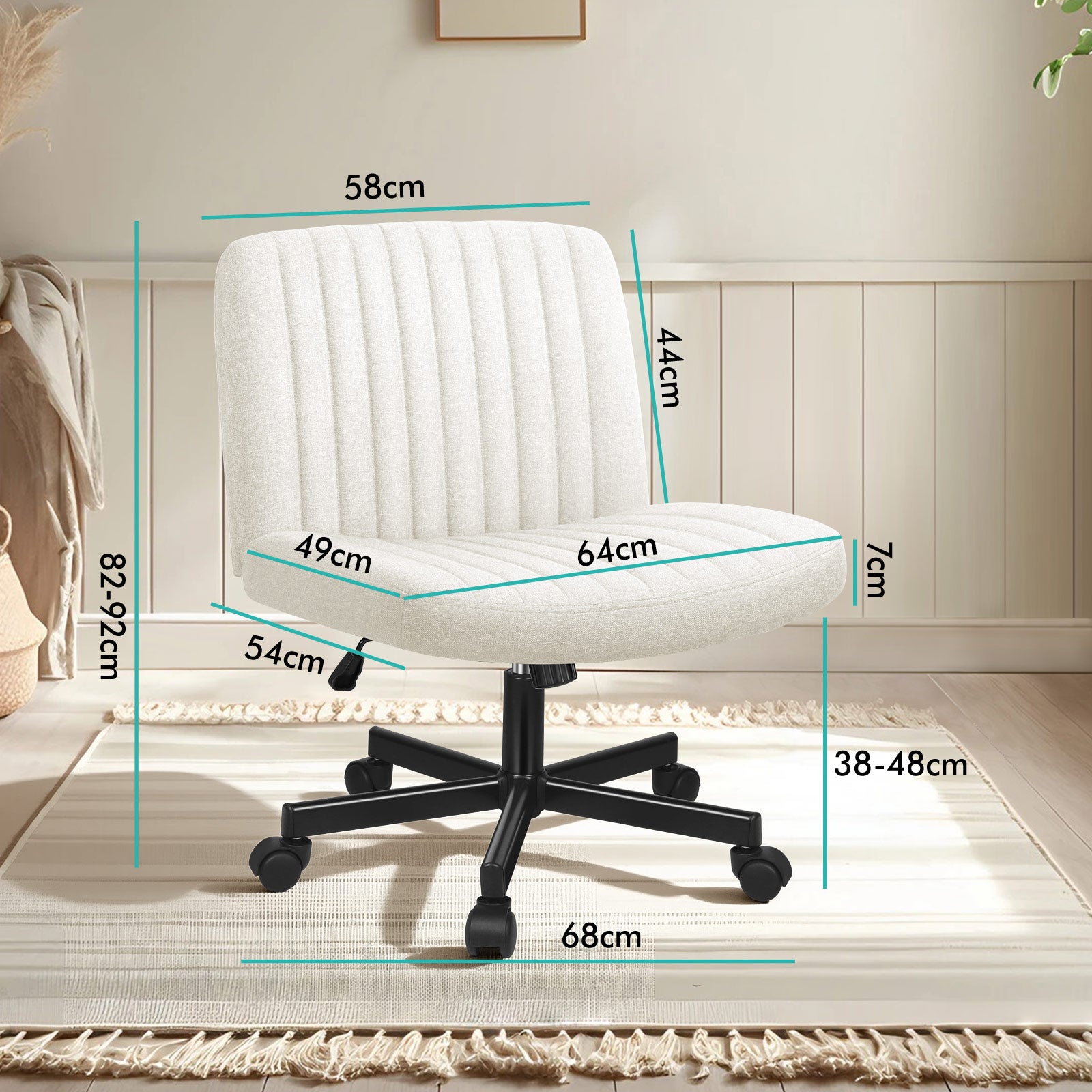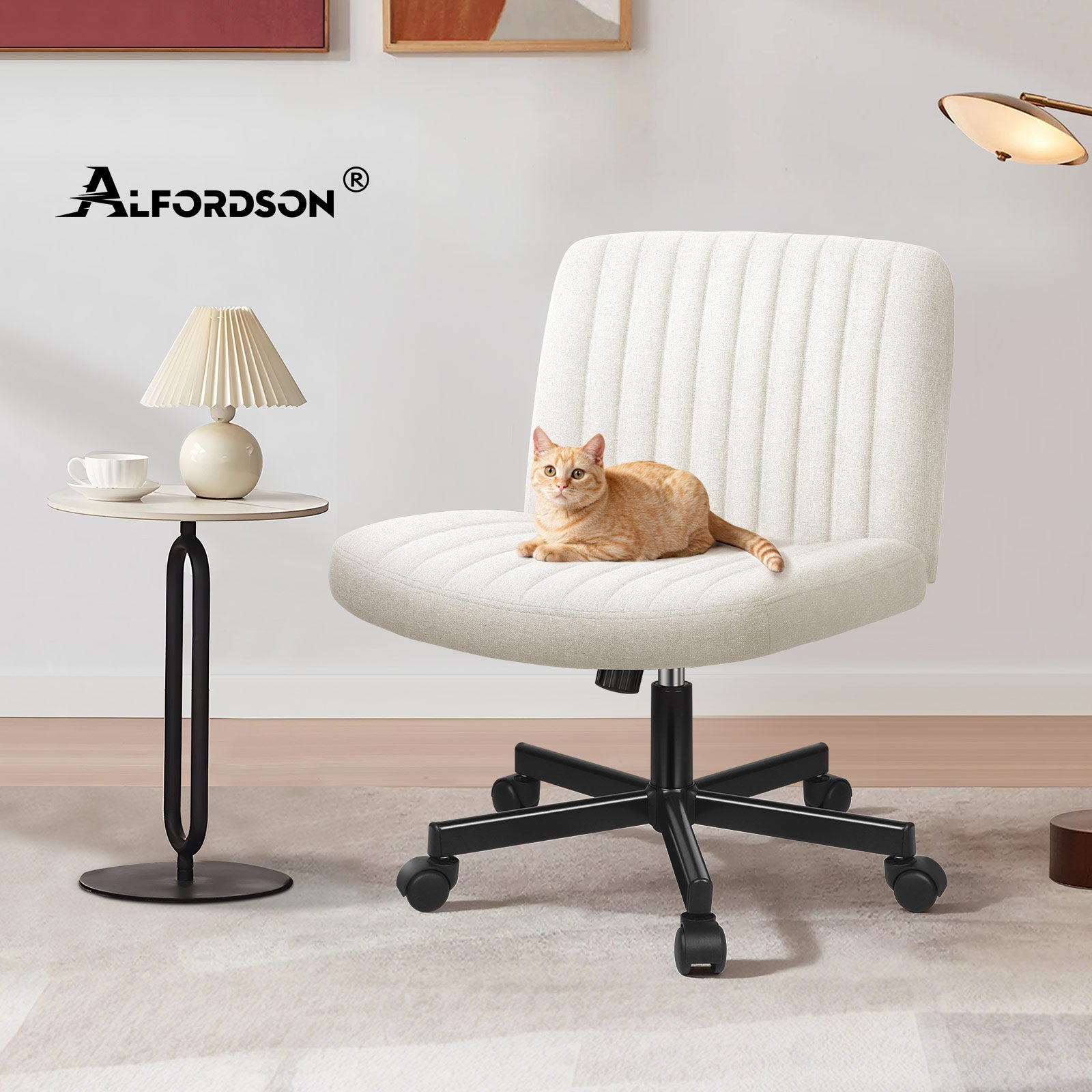 * Farbe: Beige * Sitzmaterial: Leinenstoff, hochelastischer Schaumstoff, Holzplatte * Gestellmaterial: Schwarz pulverbeschichtetes Chrom * Robuste, BIFMA-zertifizierte und Intertek-geprüfte Materialien * SGS-geprüfte Gasdruckfeder * Maximale Belastbarkeit Stuhl: 180 kg * Garantie: 1 Jahre * Detaillierte Abmessungen siehe Abbildung Lieferumfang* 1 x Alfordson Bürostuhl ohne Armlehnen * 1 x Montageanleitung