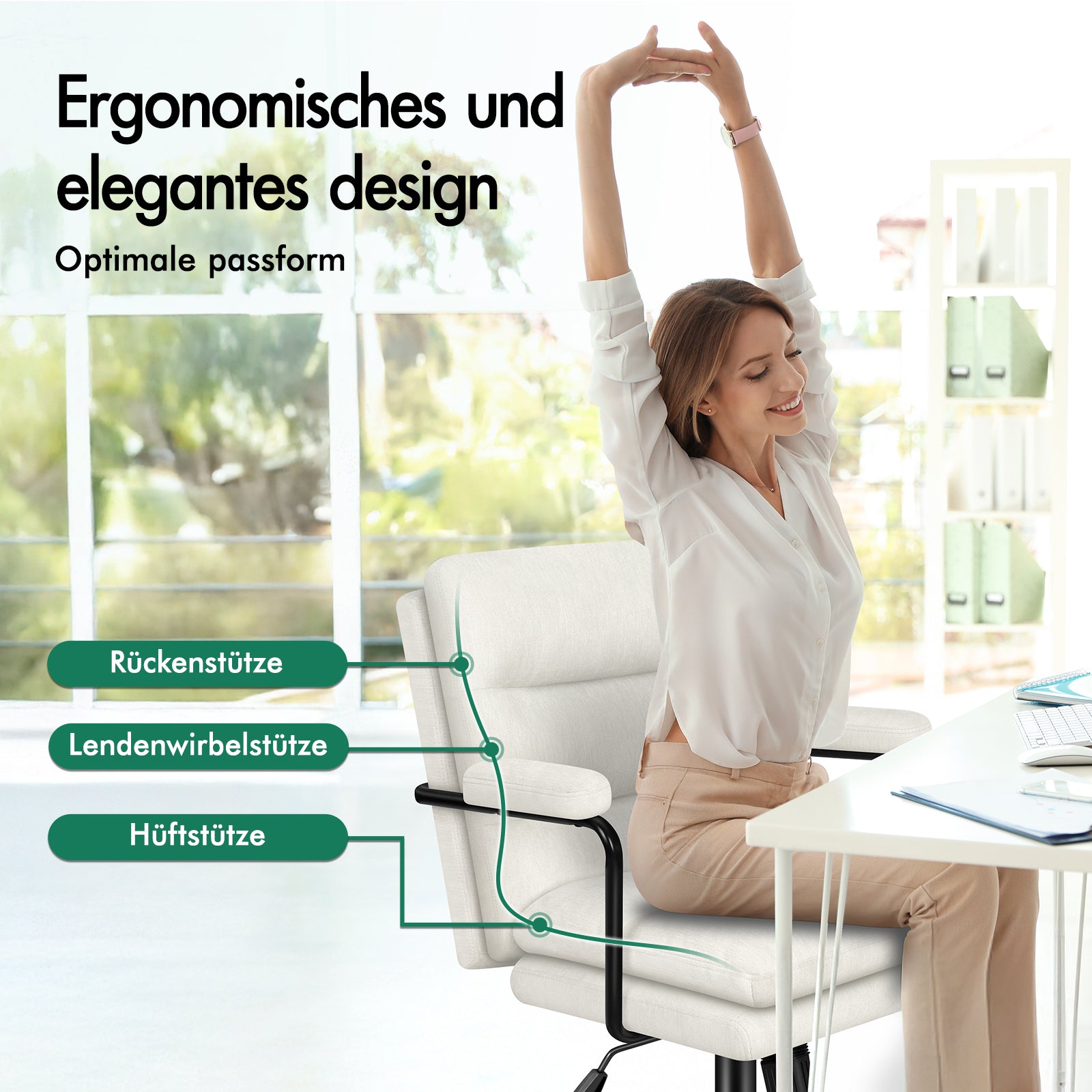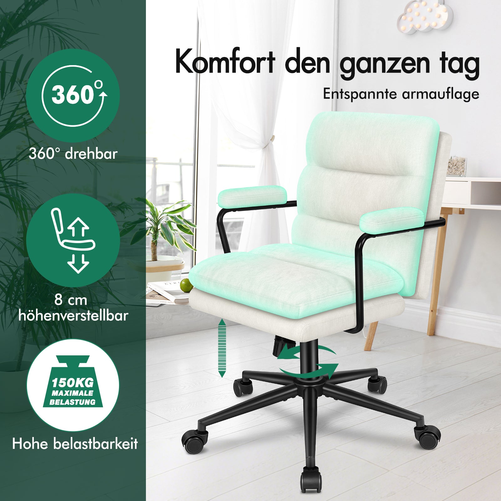 Das moderne, schlichte Design dieses Bürodrehstuhls fügt sich harmonisch in jede Einrichtung ein, egal ob zu Hause oder im Büro. Sitz und Rückenlehne sind mit hochwertigem Chenille bezogen und mit hochelastischem Schaumstoff gepolstert. Die Polsterung bietet optimale Unterstützung und höchsten Sitzkomfort, wann immer Sie sich entspannen möchten. Die ergonomisch geformten Armlehnen stützen Ihre Arme in einer natürlichen Position, entlasten Schultern und Arme und ermöglichen Ihnen so auch über längere Zeiträume maximalen Komfort.