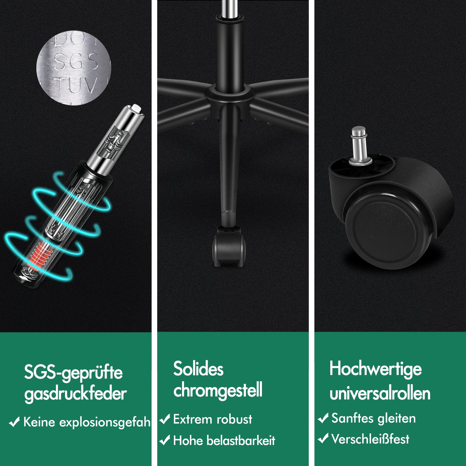 Dank des robusten Chromfußes, der TÜV-geprüften Rollen und des SGS-geprüften Gasdruckfedersystems ist der Stuhl besonders langlebig. Sie müssen sich keine Sorgen um Umkippen oder Beschädigungen machen. Noch besser: Das schwarz pulverbeschichtete Chromgestell und die Fußstütze ergänzen das moderne Design perfekt. Der um 360 Grad drehbare und höhenverstellbare Sitz sorgt für zusätzlichen Komfort. Die 360°-Rollen gewährleisten optimale Beweglichkeit und schützen gleichzeitig Ihren Boden vor Kratzern.