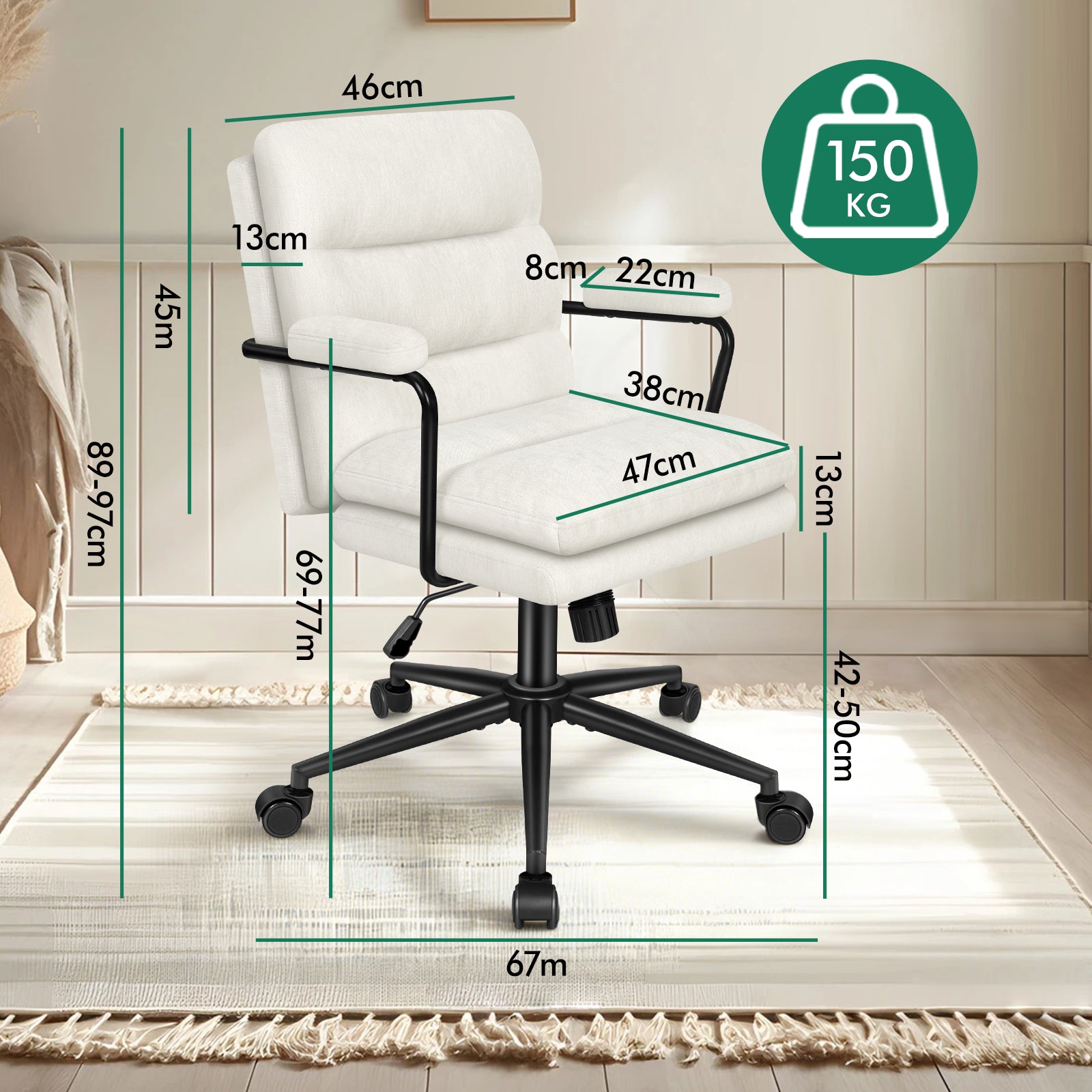 Spezifikationen* Dreischichtige Konstruktion: Robuster, schwarz pulverbeschichteter Chromstahlrahmen, Intertek-geprüfter Chenille-Schaumstoff mit hoher Dichte Robuster, schwarz pulverbeschichteter Chromstahlrahmen Intertek-geprüfte Chenille Hochdichter Schaumstoff * SGS-geprüfte Gasdruckfeder * TÜV-geprüfte Lenkrollen * Hohe Belastbarkeit: 150 kg * Maße: 67 x 67 x 89-97 cm Detaillierte Maße entnehmen Sie bitte dem Maßfoto * Farbe: Beige * Garantie: 1 Jahr