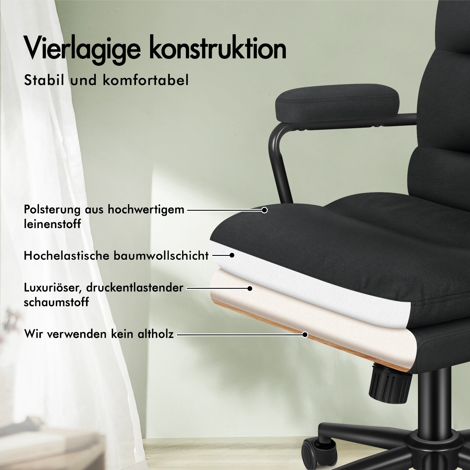 Das moderne, schlichte Design dieses Bürodrehstuhls fügt sich harmonisch in jede Einrichtung ein, egal ob zu Hause oder im Büro. Sitz und Rückenlehne sind mit hochwertigem Leinenstoff bezogen und mit hochelastischem Schaumstoff gepolstert. Die Polsterung bietet optimale Unterstützung und höchsten Sitzkomfort, wann immer Sie sich entspannen möchten. Die ergonomisch geformten Armlehnen stützen Ihre Arme in einer natürlichen Position, entlasten Schultern und Arme und ermöglichen Ihnen so auch über längere Zeiträume maximalen Komfort.