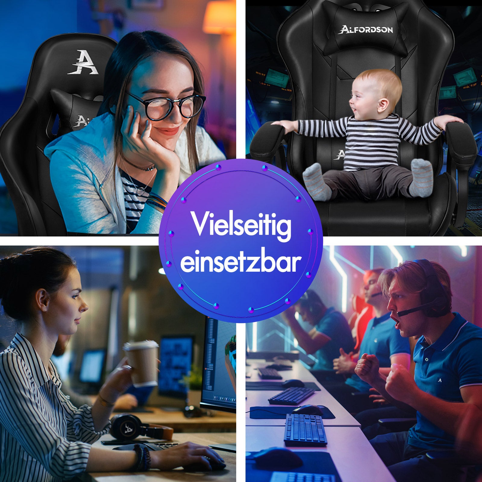 Silla gaming ALFORDSON con masaje de 2 puntos, silla de oficina con reposapiés, color negro