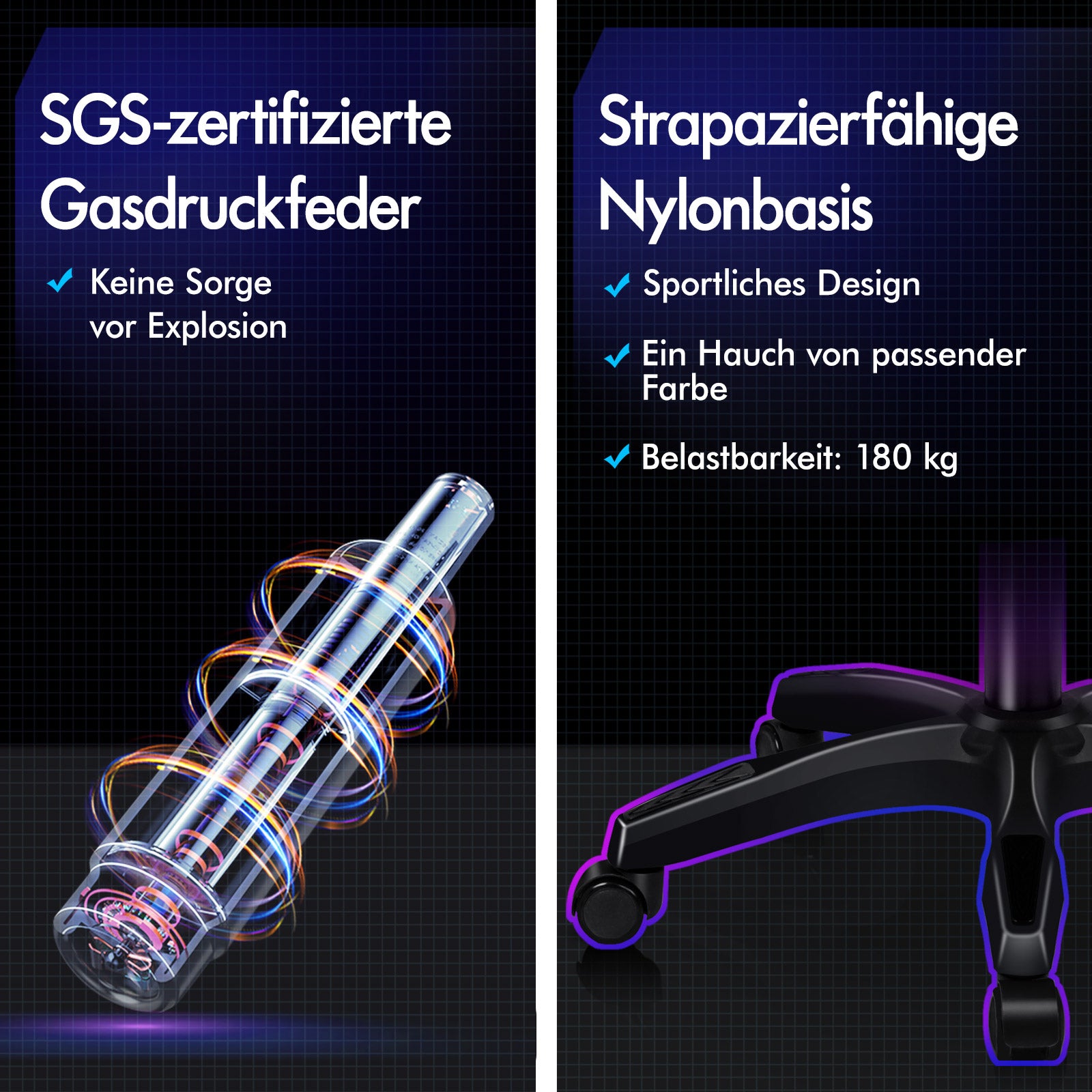 Especificaciones * Cuero PU de alta calidad aprobado por Intertek * Elevador de gas aprobado por SGS, sin miedo a explosiones * Volantes aprobados por TUV * Asiento de tres capas: cuero PU + espuma elástica + tablero de madera resistente * Alta capacidad de carga: 180 kg * 2 años de garantía * Color: Negro