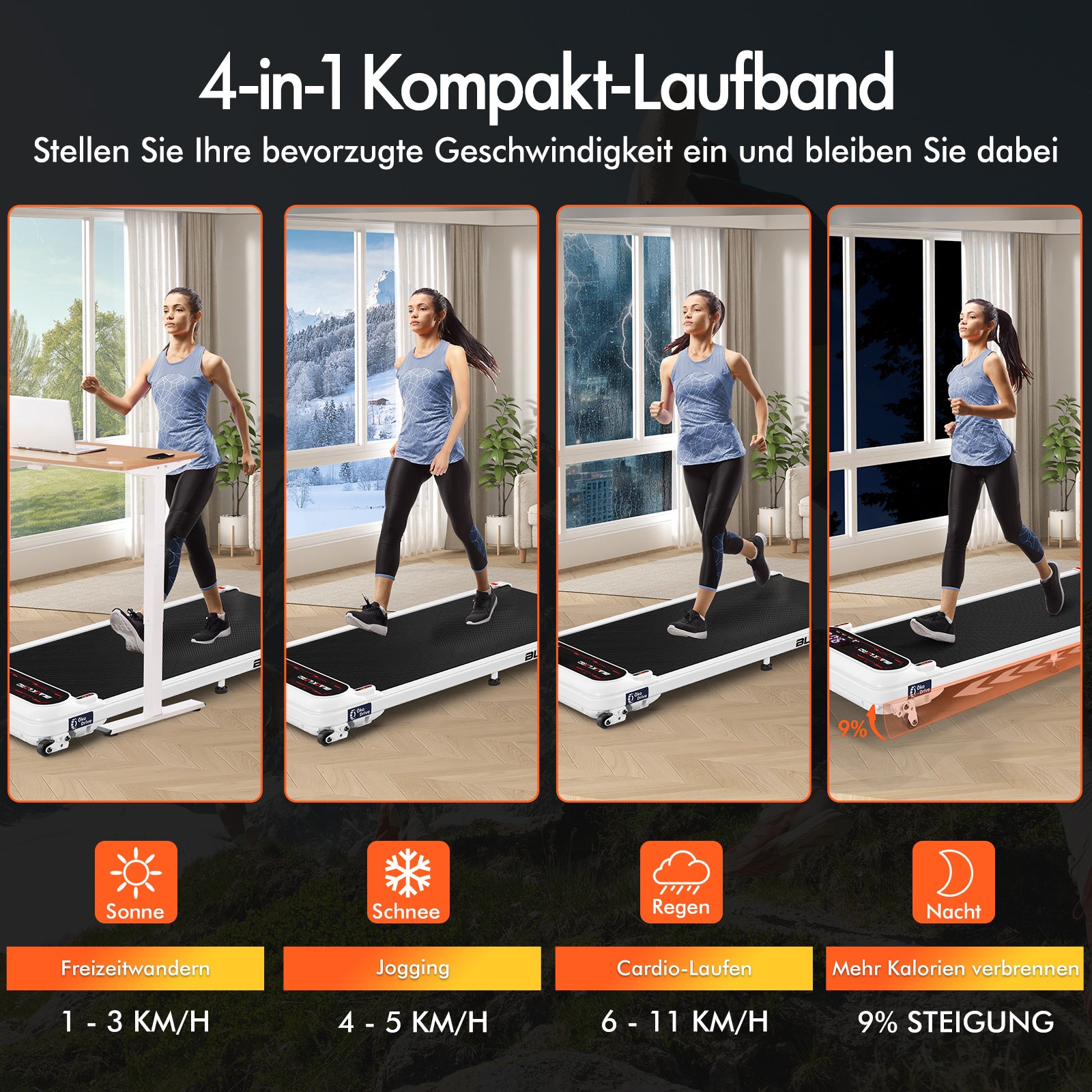 Spezifikationen* Spannung: AC 220–240 V, 50/60 Hz* Motorleistung: 3,0 PS* Geschwindigkeitsbereich: 1–11 km/h* Gewichtskapazität: 130 kg* Produktgröße: 114 cm x 52 cm x 11,5 cm* Laufbandgröße: 39 cm x 95 cm* Abmessungen: detaillierte Größenangaben siehe Maßfoto* Farbe: Weiß* Zusammenbau erforderlich: Ja