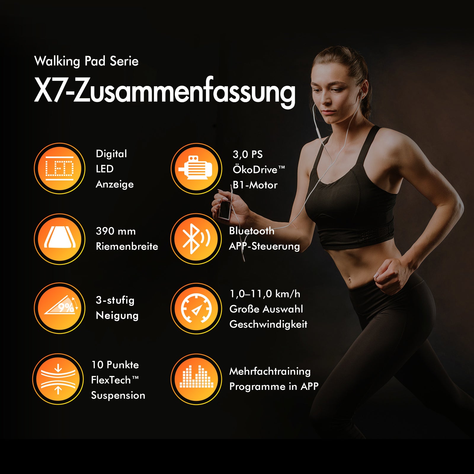 Das Walking Pad X7 ist das ideale Heimtrainingsgerät, um täglich in Bewegung zu kommen und Kalorien zu verbrennen. Dank der einzigartigen integrierten Bluetooth-Technologie können Sie drahtlos auf die FitShow®-App auf Ihrem Smartphone zugreifen, um Ihre Trainingsdaten zu synchronisieren und zu verfolgen. Dank des großen LED-Displays behalten Sie die Übersicht und präzise Kontrolle. Nutzen Sie Messwerte wie Geschwindigkeit, Kilometerstand, Kalorienverbrauch und mehr, um Ihre Ziele zu erreichen und Ihre Grenzen zu erweitern. Dieses Laufband verfügt über einen leistungsstarken und energieeffizienten 3,0-PS-ÖkoDriveTM B1-Motor mit digitaler Geschwindigkeitsregelung von 1–11 km/h. Per Fernbedienung oder App können Sie Ihr Training in der gewünschten Geschwindigkeit genießen.