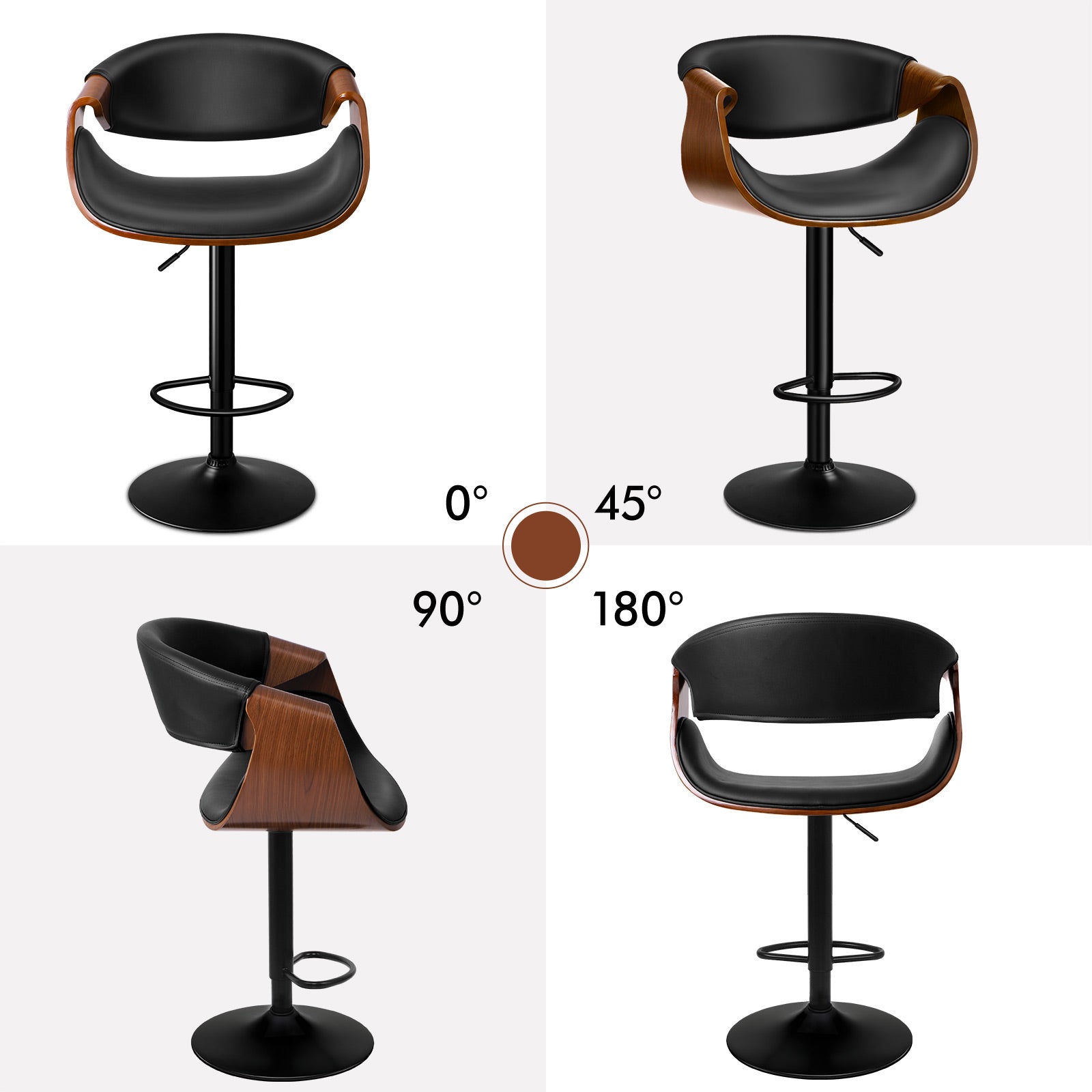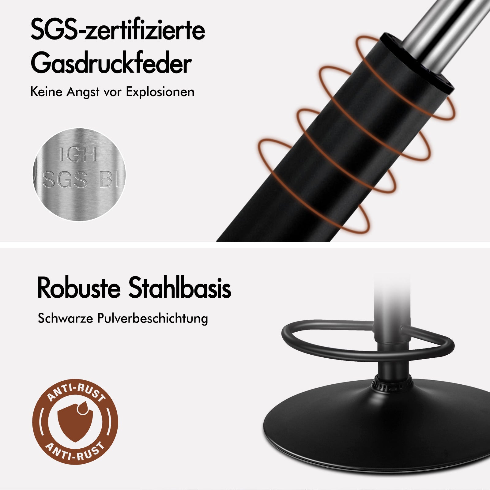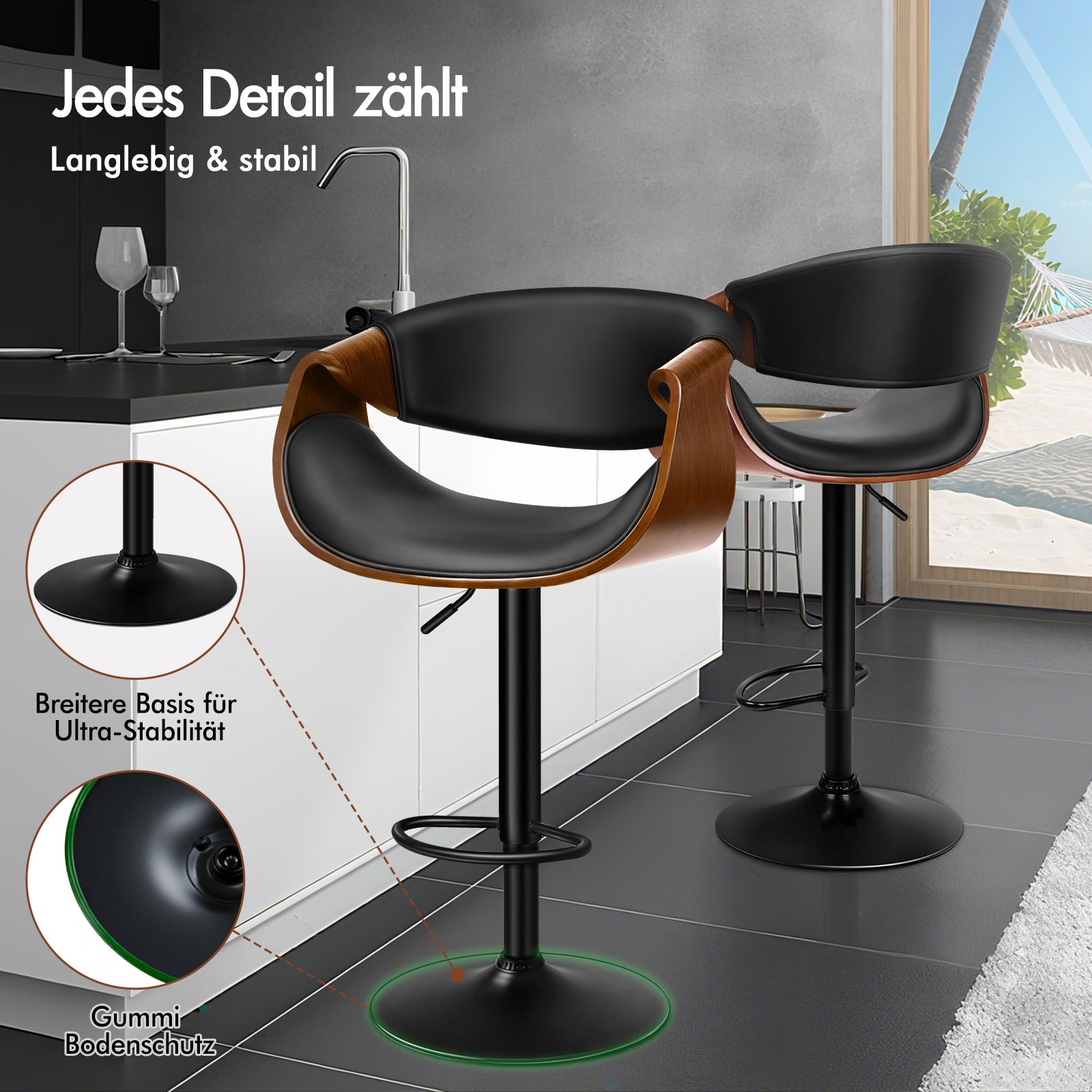 Spezifikationen * SGS-geprüfte Gasdruckfeder, keine Explosionsgefahr* Farbe: Holzsitz mit schwarzer Polsterung* Sitzmaterial: Massivsperrholz und PU-Leder* Basismaterial: Stahl* Verarbeitung: Zarte Holzmaserung (Sitz) und schwarz pulverbeschichtetes Chrom (Basis)* Artikelhöhe: 90–110 cm* Artikelbreite: 56 cm* Artikeltiefe: 56 cm* Abmessungen: Detaillierte Größenangaben finden Sie auf dem Maßfoto* Hohe Gewichtskapazität: 150 kg