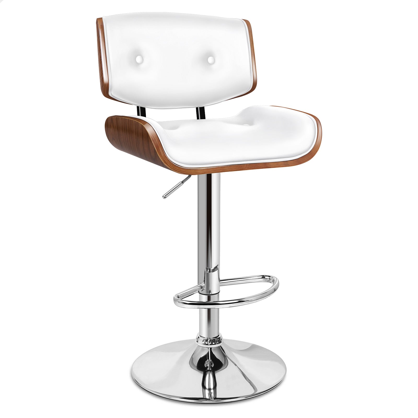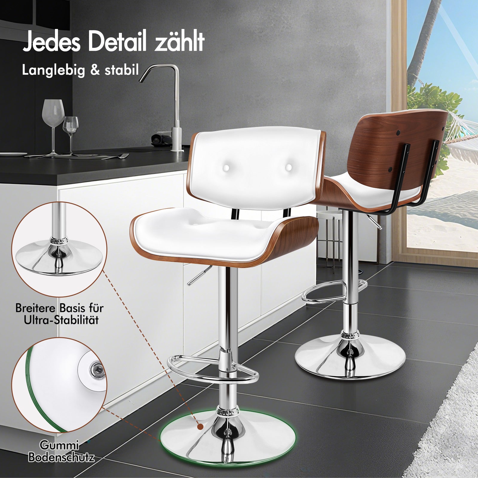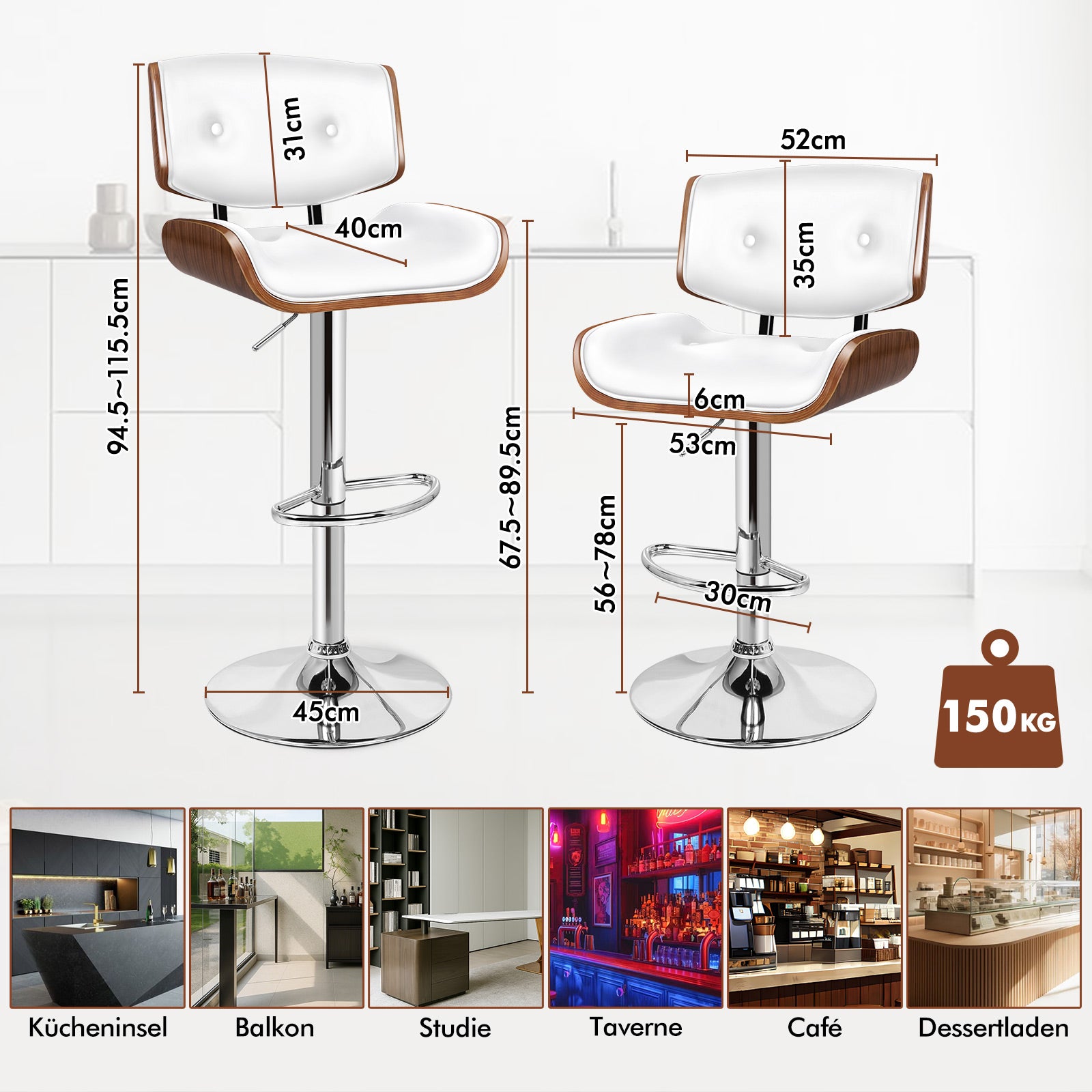 Spezifikationen * SGS-geprüfte Gasdruckfeder, keine Explosionsgefahr * Farbe: Holzsitz mit weißer Polsterung * Sitzmaterial: Massivsperrholz und PU-Leder* Basismaterial: Stahl* Verarbeitung: Zarte Holzmaserung (Sitz) und Hochglanzchrom (Basis)* Artikelhöhe: 94,5–115,5 cm* Artikelbreite: 45 cm* Artikellänge: 53 cm* Abmessungen: Detaillierte Größen siehe Maßfoto* Hohe Gewichtskapazität: 150 kg