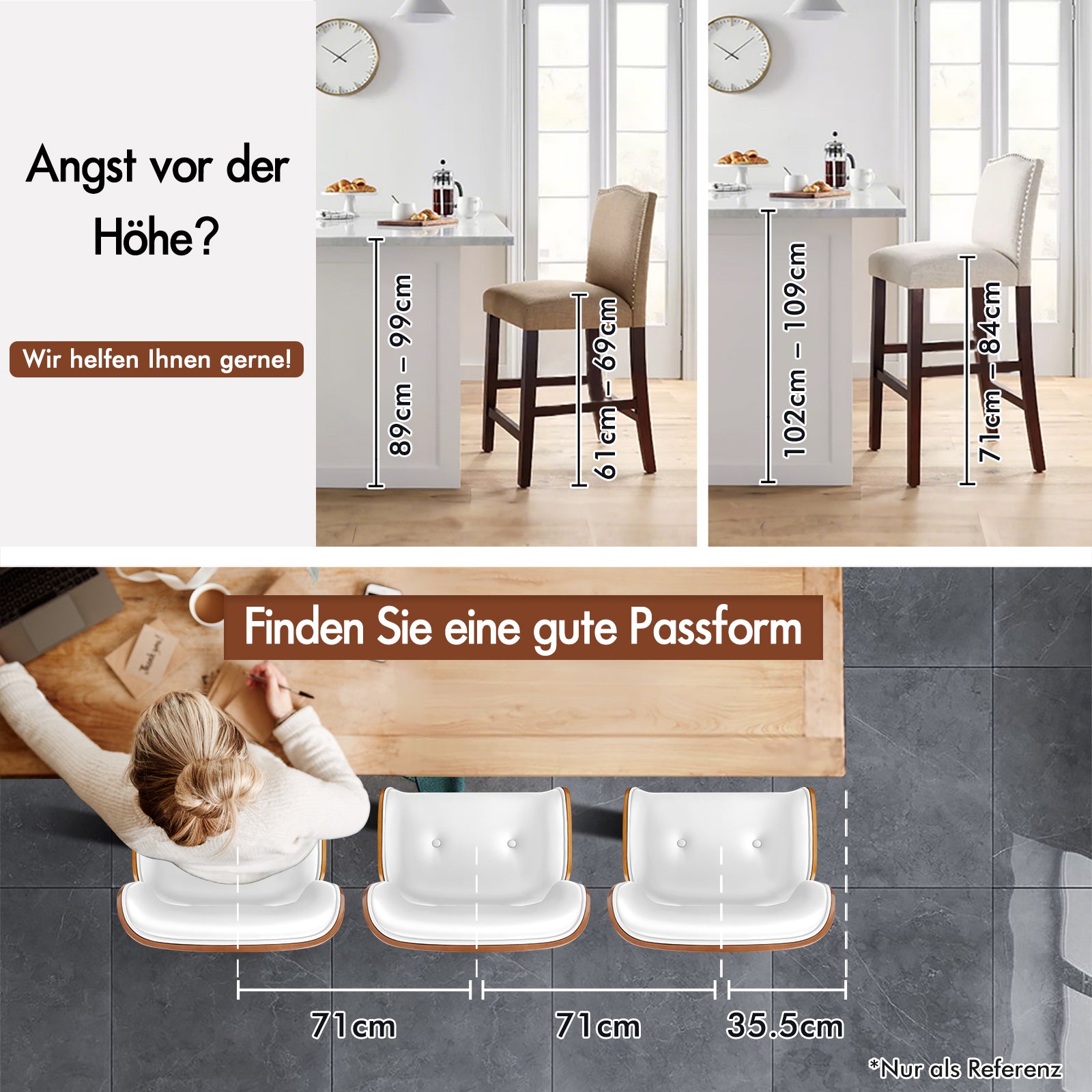 Nur ein kleiner Hinweis: Wenn Sie planen, einen Barhocker an Ihrer Küchentheke oder Kücheninsel aufzustellen, sollten Sie mindestens 3–4 Stück verwenden, damit mehr Personen zum Frühstück, für Snacks oder Getränke zusammenkommen können. So sparen Sie sich den Gang ins Esszimmer oder Wohnzimmer.
