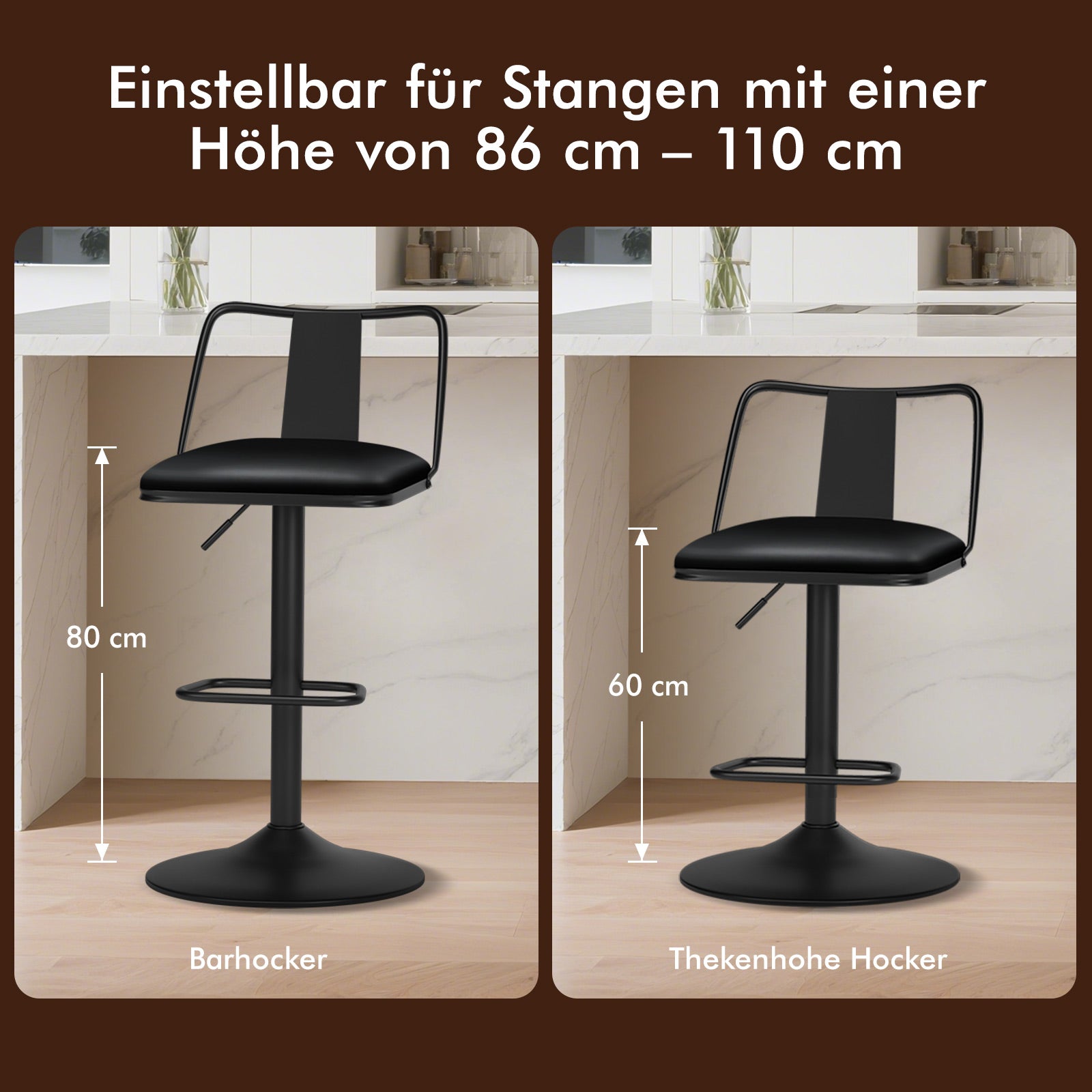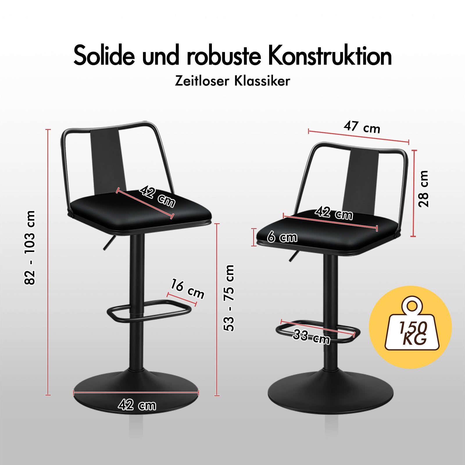 Spezifikationen * SGS-geprüfte Gasdruckfeder, keine Explosionsgefahr* Farbe: Schwarzer Rahmen mit schwarzer Polsterung* Sitzmaterial: PU-Leder* Basismaterial: Stahl* Oberfläche: Schwarz pulverbeschichtetes Chrom* Artikelhöhe: 82–103 cm* Artikelbreite: 42 cm* Artikellänge: 47 cm* Abmessungen: Detaillierte Größen siehe Maßfoto* Hohe Gewichtskapazität: 150 kg
