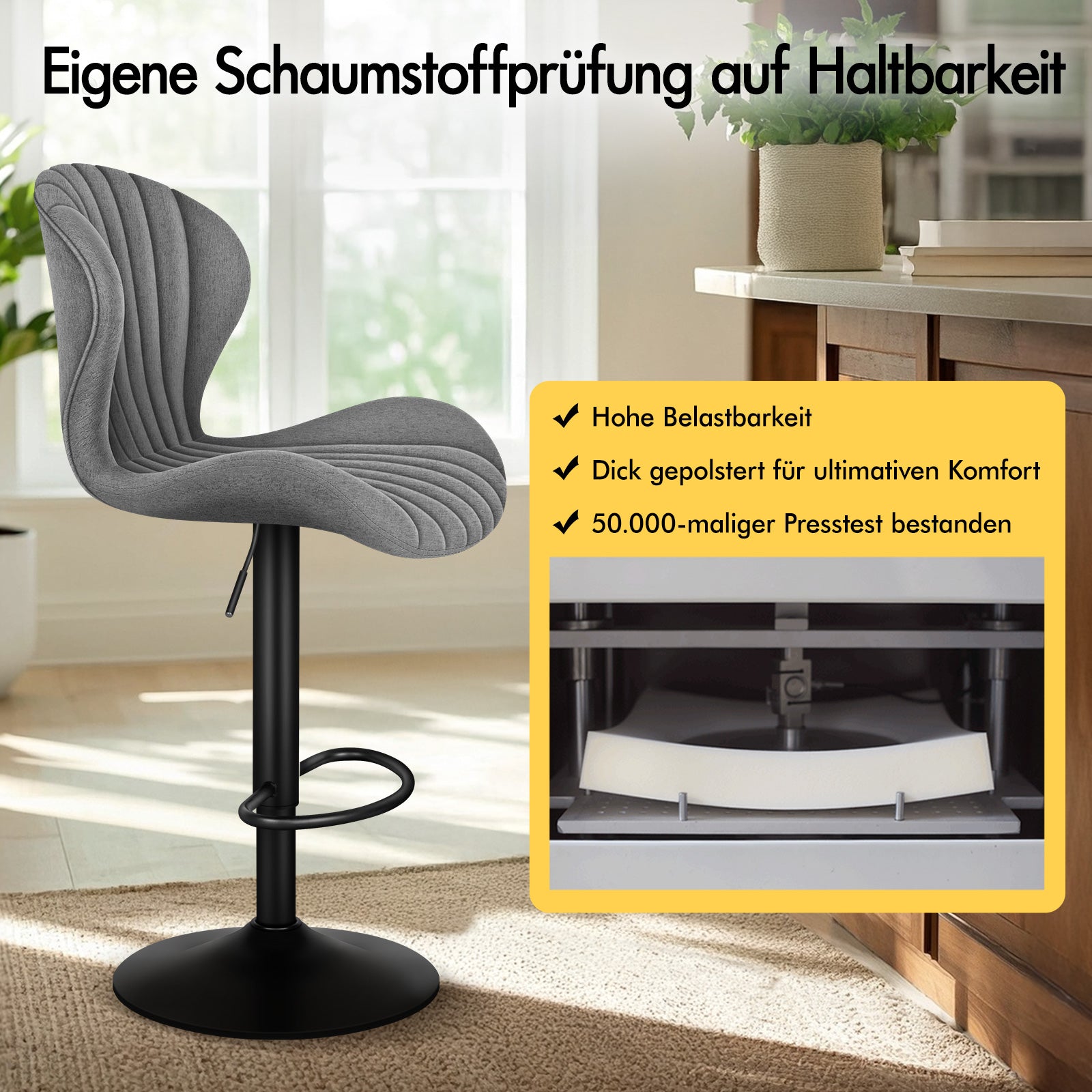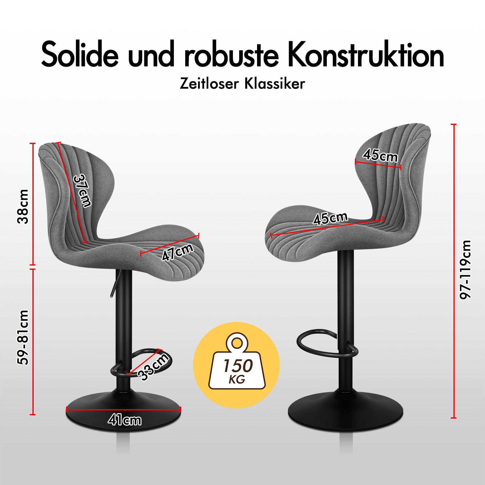 Spezifikationen * SGS-geprüfte Gasdruckfeder, keine Explosionsgefahr* Farbe: Grau* Sitzmaterial: Leinenstoff* Basismaterial: Stahl* Oberfläche: Schwarz pulverbeschichtetes Chrom* Artikelhöhe: 97–119 cm* Artikelbreite: 45 cm* Artikellänge: 45 cm* Abmessungen: Detaillierte Größenangaben finden Sie auf dem Maßfoto* Hohe Gewichtskapazität: 150 kg