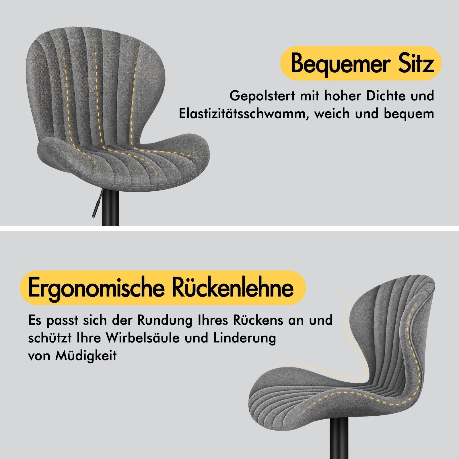 * Modernes und industrielles Design* Ergonomisch geformte Rückenlehne und Sitzfläche für eine perfekte Körperkontur* Hochwertiger Leinenbezug* Großzügige, hochelastische Schaumstoffpolster* Sanfte 360-Grad-Drehung* Feinfühlige Gasdruckfeder* Höhenverstellung nach Bedarf* Gebogene Fußstütze zum Ablegen der Füße* Robuster, schwarz verchromter Fuß, rost- und korrosionsbeständig* Breiter Fuß für höchste Stabilität* Solide und robuste Konstruktion* Gummi-Bodenschoner