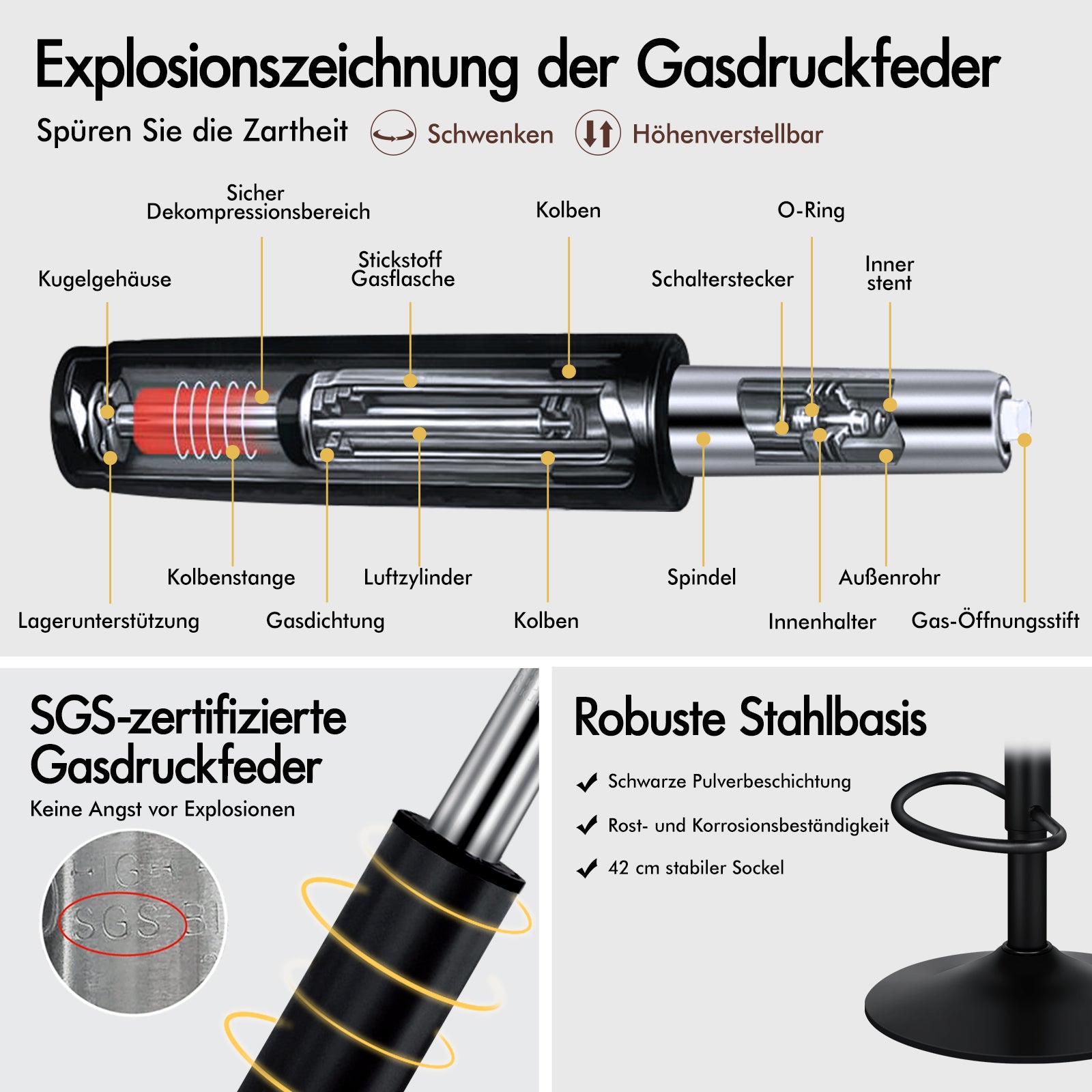 Spezifikationen * SGS-geprüfte Gasdruckfeder, keine Explosionsgefahr* Farbe: Schwarz/Grau* Sitzmaterial: PU-Leder/Stoff/Luftleder* Basismaterial: Stahl* Oberfläche: Schwarz pulverbeschichtetes Chrom* Artikelhöhe: 97–119 cm* Artikelbreite: 45 cm* Artikellänge: 45 cm* Abmessungen: Detaillierte Größenangaben finden Sie auf dem Maßfoto* Hohe Gewichtskapazität: 150 kg