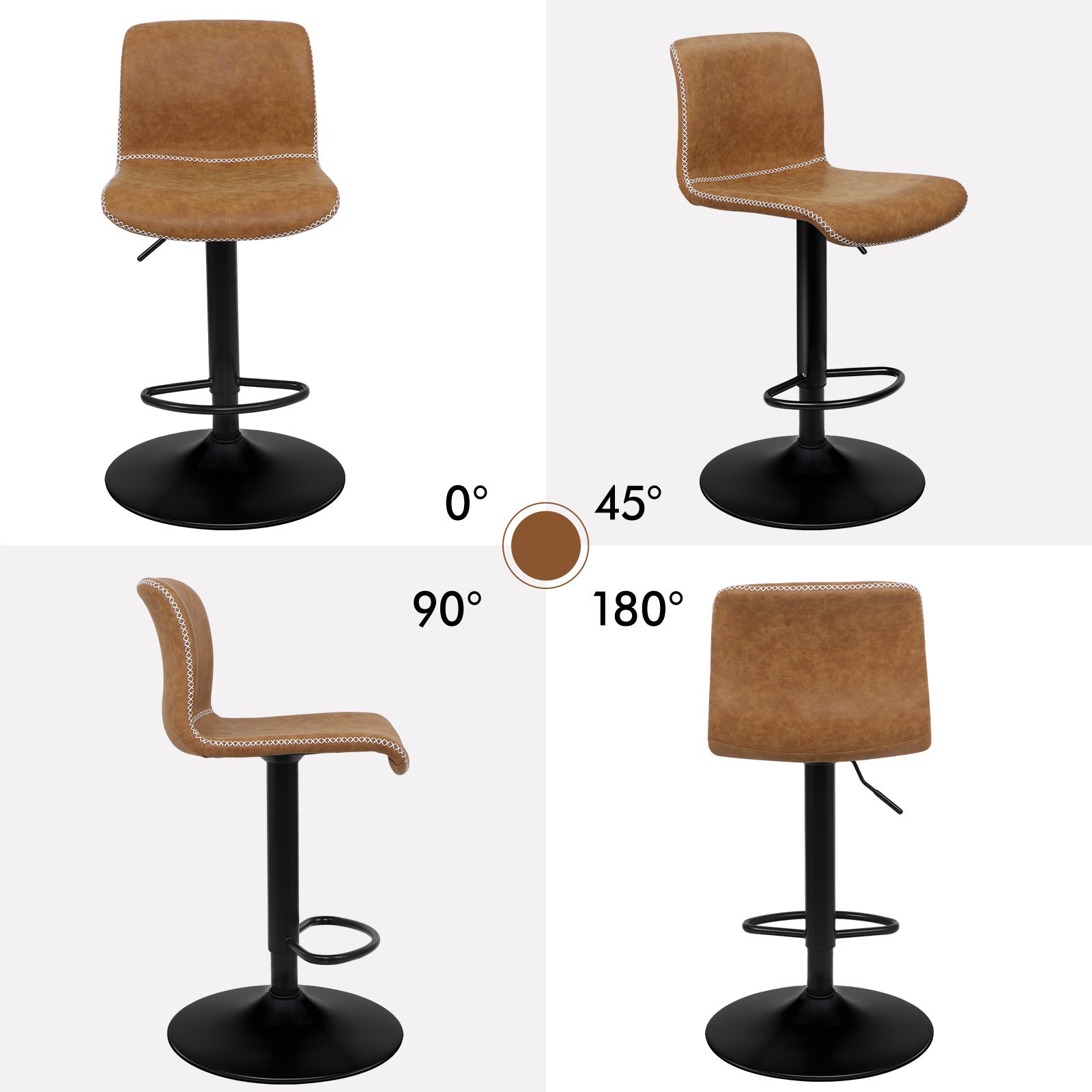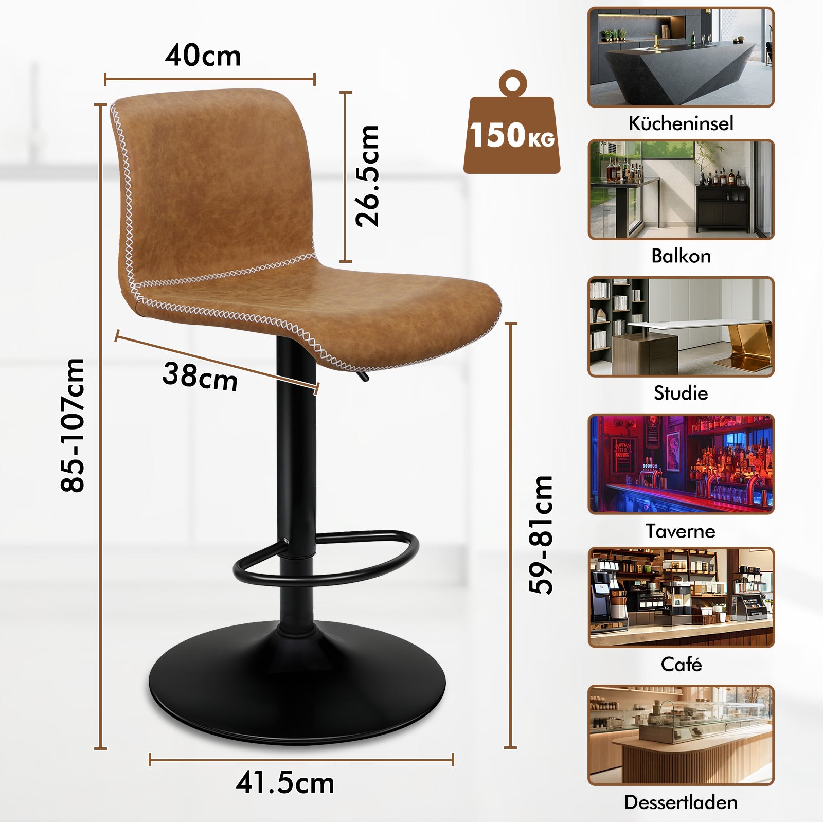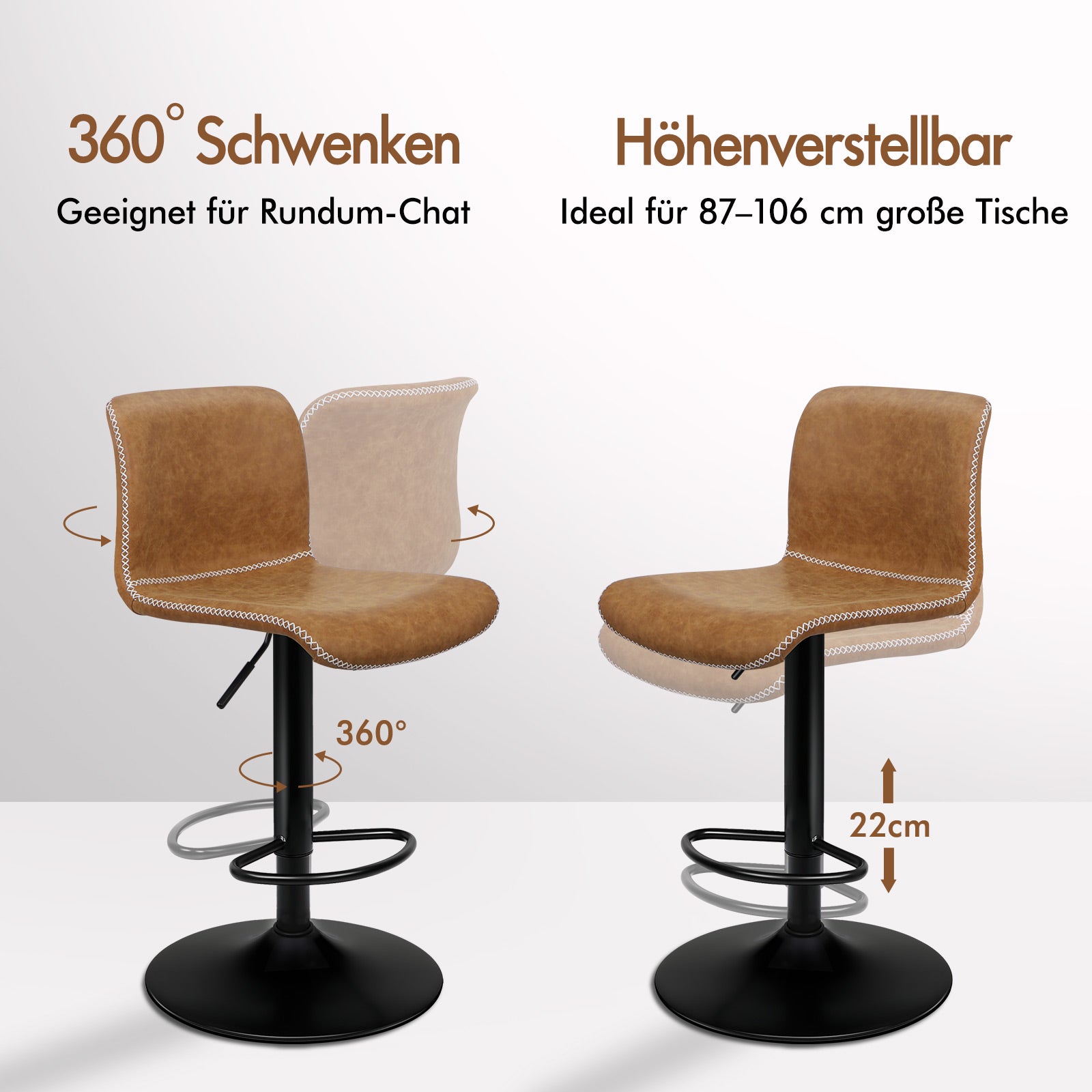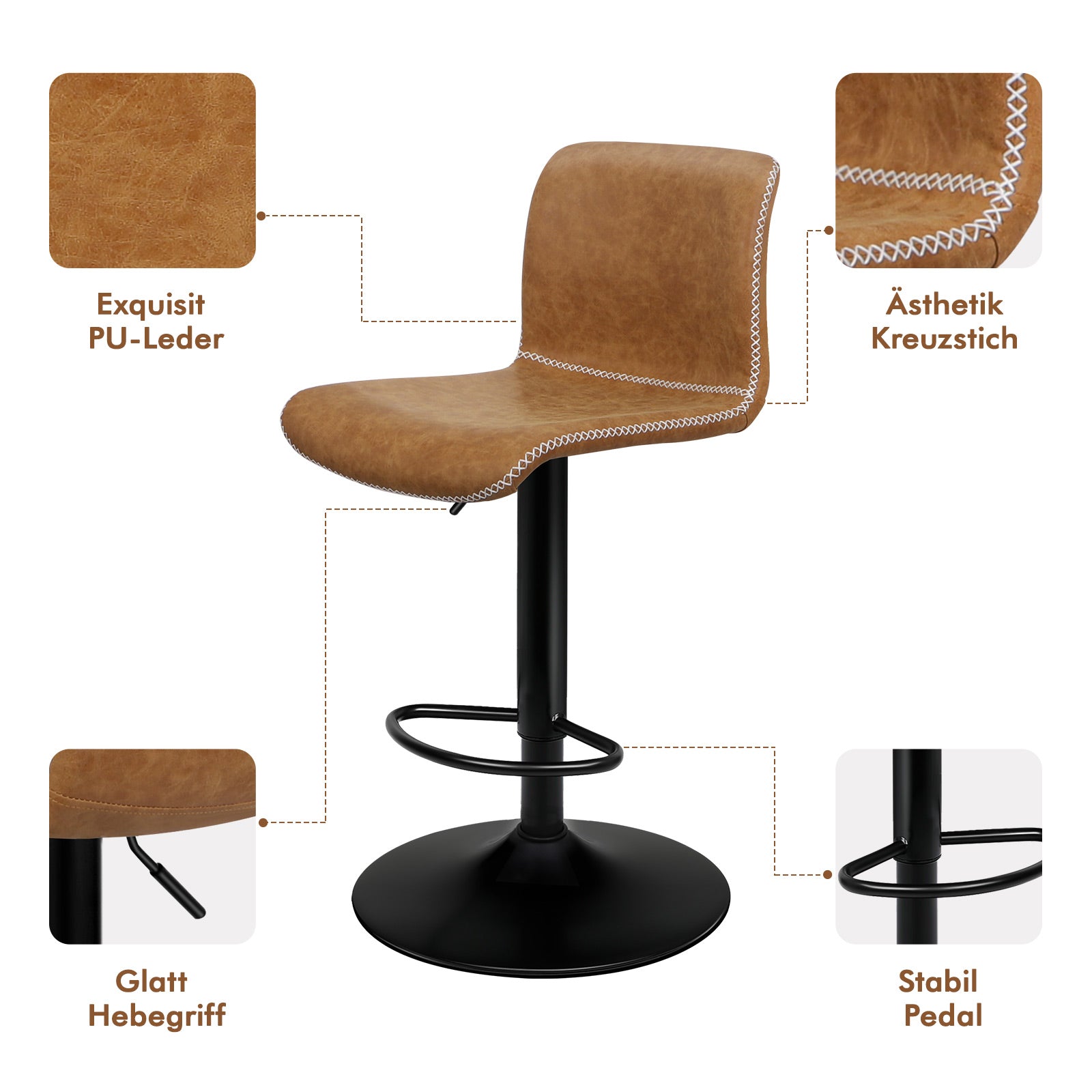 Er besticht nicht nur durch sein ikonisches Design und seine zeitlose Anziehungskraft, sondern ist auch gemütlich und praktisch. Sitz und Rückenlehne sind mit Vintage-PU-Leder bezogen und mit hochelastischem Schaumstoff und einer bequemen Polsterung gefüllt. Dank des hochdichten Schaumstoffs bieten sie genau die richtige Unterstützung für ein angenehmes Sitzerlebnis. Dank der SGS-geprüften Gasdruckfeder müssen Sie sich keine Sorgen um Explosionen machen. Der 360-Grad-Drehmechanismus und die verstellbare Sitzhöhe sorgen für entspannte Gespräche.