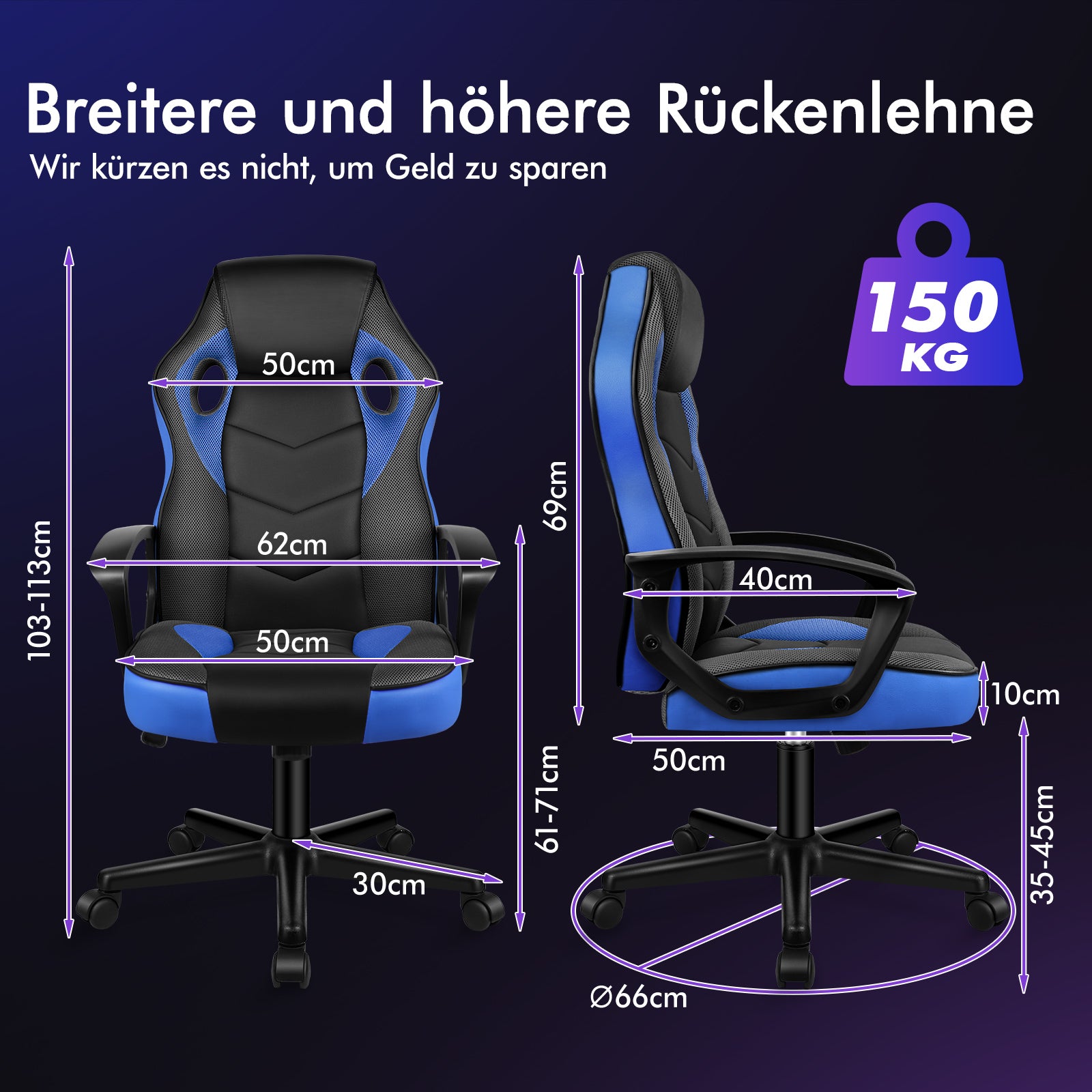 Spezifikationen * Robuste BIFMA-zertifizierte und Intertek-zugelassene Materialien * SGS-zugelassene Gasdruckfeder, keine Explosionsgefahr * TÜV-geprüfte Rollen Räder * Hohe Tragkraft: 150 kg * 1 Jahre Garantie * Farbe: Schwarz & Blau * Maße: 66 x 66 x 103–113 cm * Detaillierte Größenangaben siehe Maßfoto
