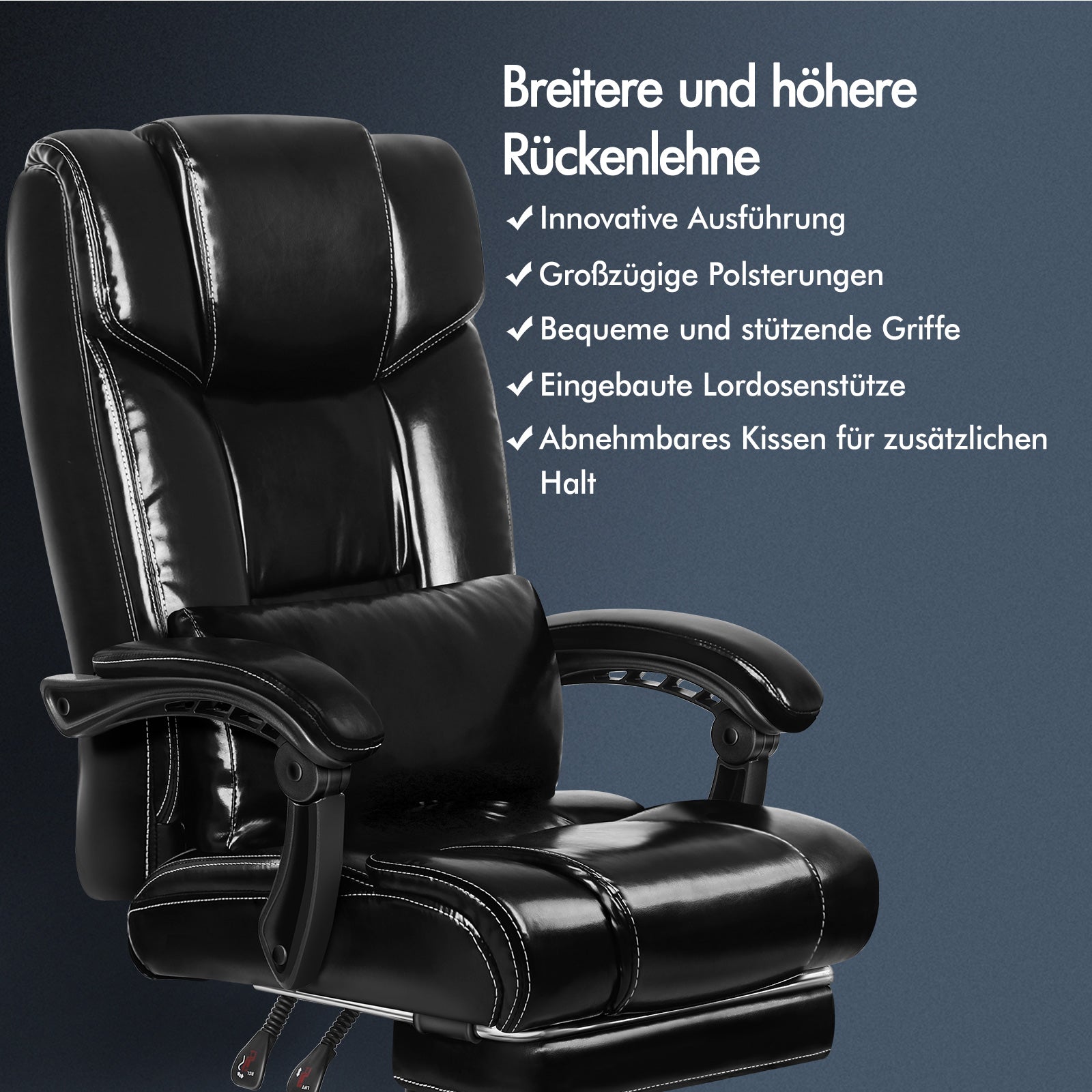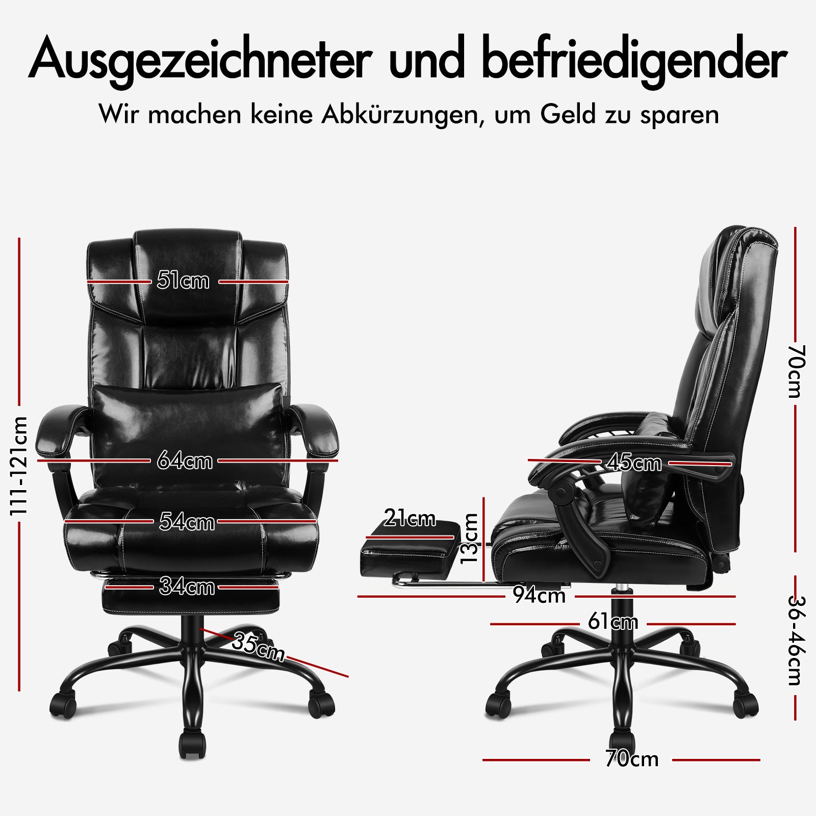* Ewiges Modell mit luxuriöser Polsterung * Zweischichtiges Design mit hoher Rückenlehne * Ergonomisches Design zur vollständigen Konturierung Ihrer Körperform * Extragroßes Kissen für bessere Unterstützung der Lendenwirbelsäule * Bis zu 150 Grad verstellbare Rückenlehne * Kann in der Liegeposition arretiert werden * Ausziehbare, gepolsterte Fußstütze * Premium-Universalräder * Reibungslos um 360 Grad drehbar * Doppelt genähte Polsterung * Integrierte Lenden- und Rückenstütze * Deluxe-Armlehnen aus PP-Kunststoff mit Polsterung, breit und stützend * Hochelastischer Schaumstoff * Beseitigt Rücken- und Schulterdruck * Schwarz pulverbeschichteter Chromsockel, klassisch und weniger anfällig für Verschmutzung * Ideal für Heimbüros, Sitzungssäle und geschäftliche Zwecke