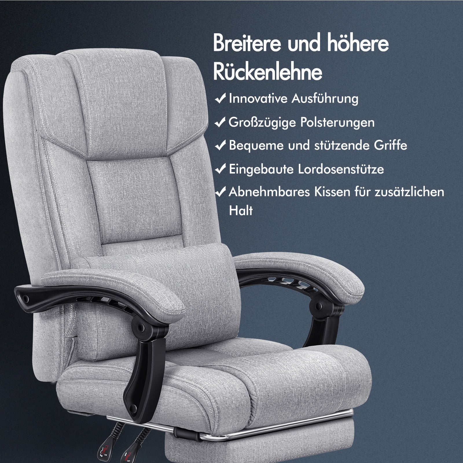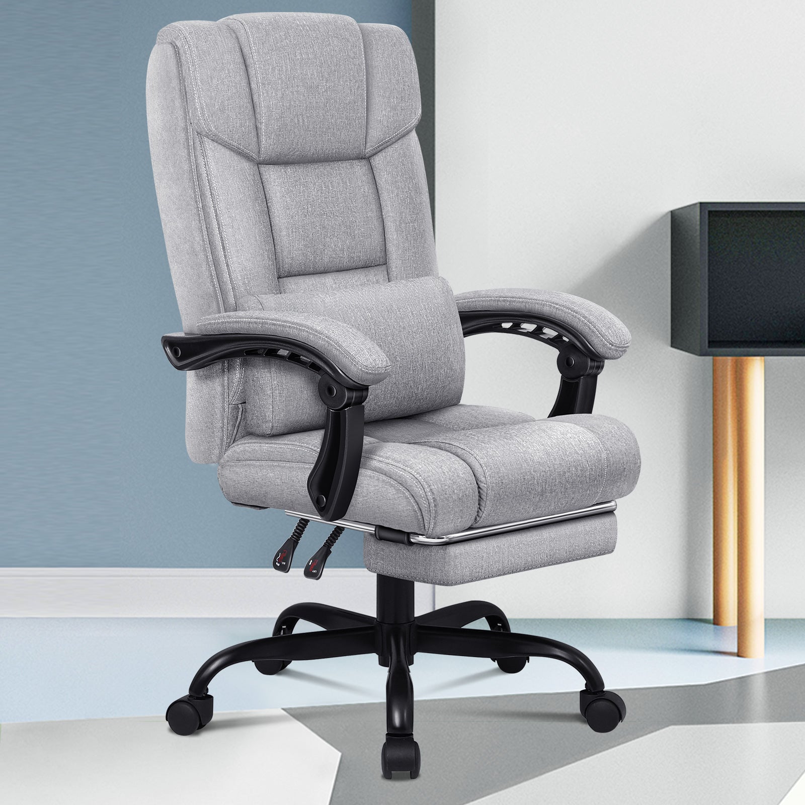 Spezifikationen * Von Intertek zugelassenes, hochwertiges Leinengewebe * SGS-zugelassener Gaslift, keine Angst vor Explosionen * TÜV-zugelassene Lenkrollen * Dreischichtiger Sitz: Leinenstoff + elastischer Schaumstoff + Holzbrett * Wir verwenden keinen recycelten Schaumstoff oder Holzbretter * Hohe Gewichtskapazität: 180kg * Garantie: 2 Jahre * Farbe: Grau