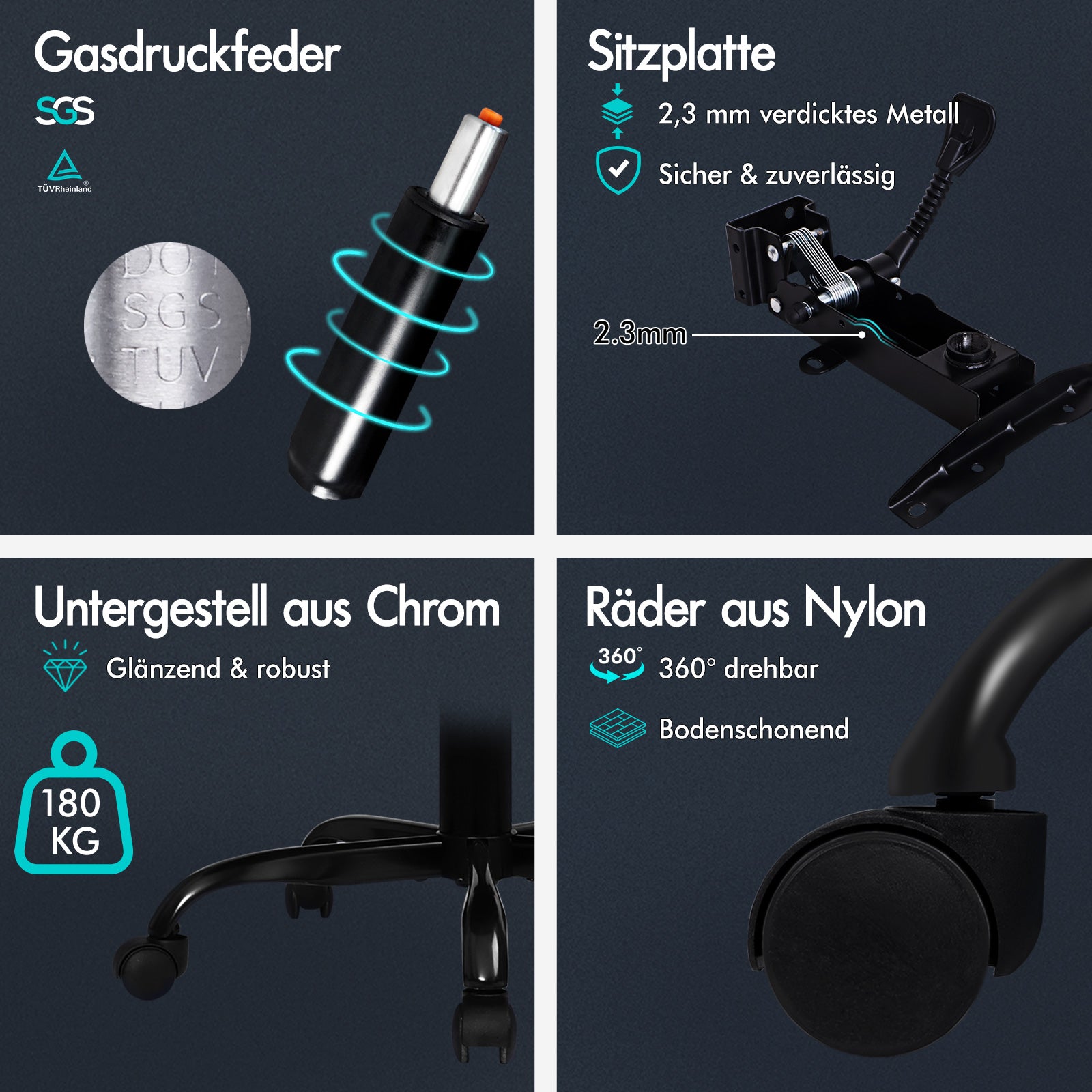 Spezifikationen * Intertek-geprüftes hochwertiges PU-Leder/Leinengewebe * SGS-geprüfte Gasdruckfeder, keine Explosionsgefahr * TÜV-geprüfte Lenkrollen * Dreischichtiger Sitz: PU-Leder/Leinengewebe + elastischer Schaumstoff + Holzplatte * Wir verwenden keinen wiedergewonnenen Schaumstoff oder Holzplatten * Hohe Gewichtskapazität: 180 kg * Garantie: 1 Jahre * Farbe: Schwarz, Grau