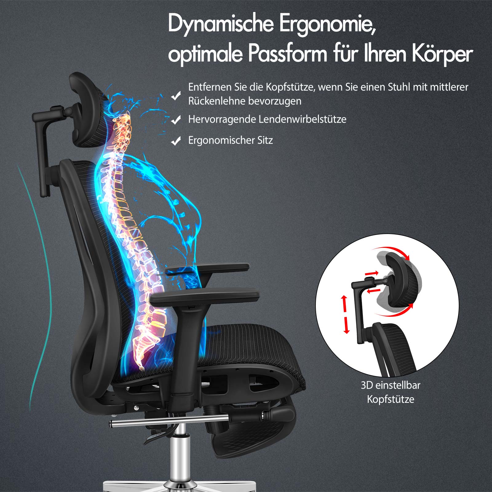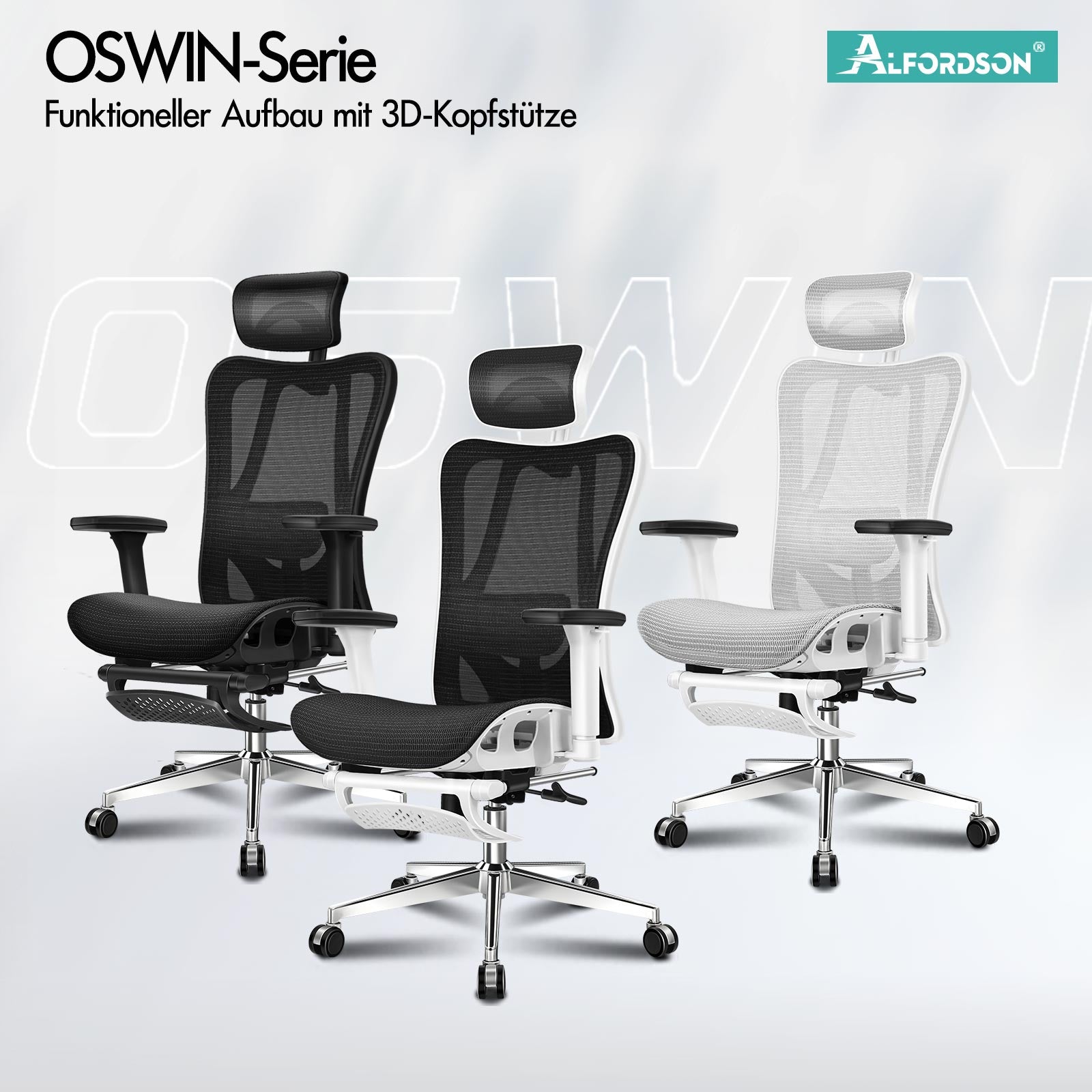 Merkmale OSWIN-Serie – Funktionelle Struktur mit 3D-verstellbarem Kopf* Umfassende Unterstützung für optimalen Komfort * Verbesserte Rücken- und selbstanpassende Lendenwirbelstütze, beseitigt Druck im Lendenbereich *3D-Kopfstütze – Winkel, Höhe und Vorwärts-/Rückwärtsverstellung *Hochfeste AdvWeave™-Netzpolsterung * Äußerst atmungsaktiv und langlebig * Bis zu 150 Grad Rückenlehnenneigung, kann im gewünschten Winkel arretiert werden * Flexible Neigungsfunktion, Einstellknopf zum Anpassen des Spannungsniveaus * 3D-verstellbare Armlehnen mit innovativer PU-Oberfläche Rechtsdrehung * 7 cm Auf- und Ab-Einstellung in 7 Gängen * 6 cm Vor- und Rückwärtseinstellung * Höheneinstellung passend zu Ihren Bedürfnissen * Sanfte 360-Grad-Schwenkung * Einziehbare Nylon-Fußstütze * Stilvoller Chromfuß, der weniger schmutzanfällig ist als Kunststofffüße * Hochwertige Universalräder, eine reibungslose Mobilität * Ideal für Gamer, Home-Office und geschäftliche Zwecke