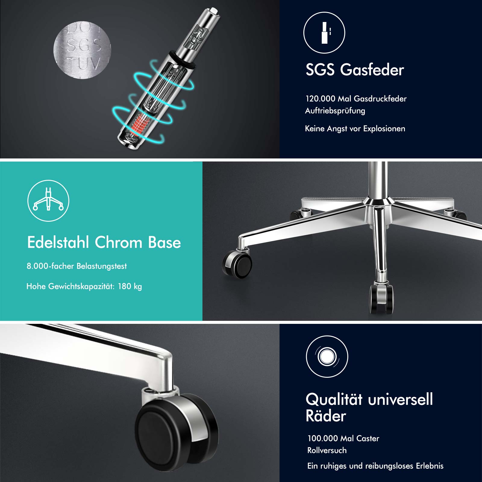 Gleiten Sie sanft auf einer verstärkten Basis - Der Stuhl ist mit einer stabilen Chrombasis, TÜV-zertifizierten Rollen und einem von SGS zugelassenen Gasdruckfedersystem ausgestattet und somit langlebig. Sie müssen sich keine Sorgen machen, dass er umkippt oder explodiert. Der um 360 Grad drehbare und höhenverstellbare Sitz sorgt für zusätzlichen Komfort.
