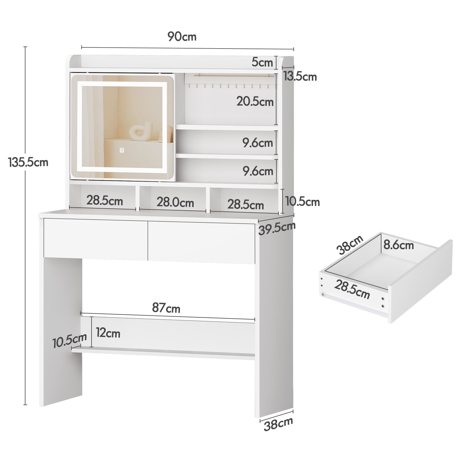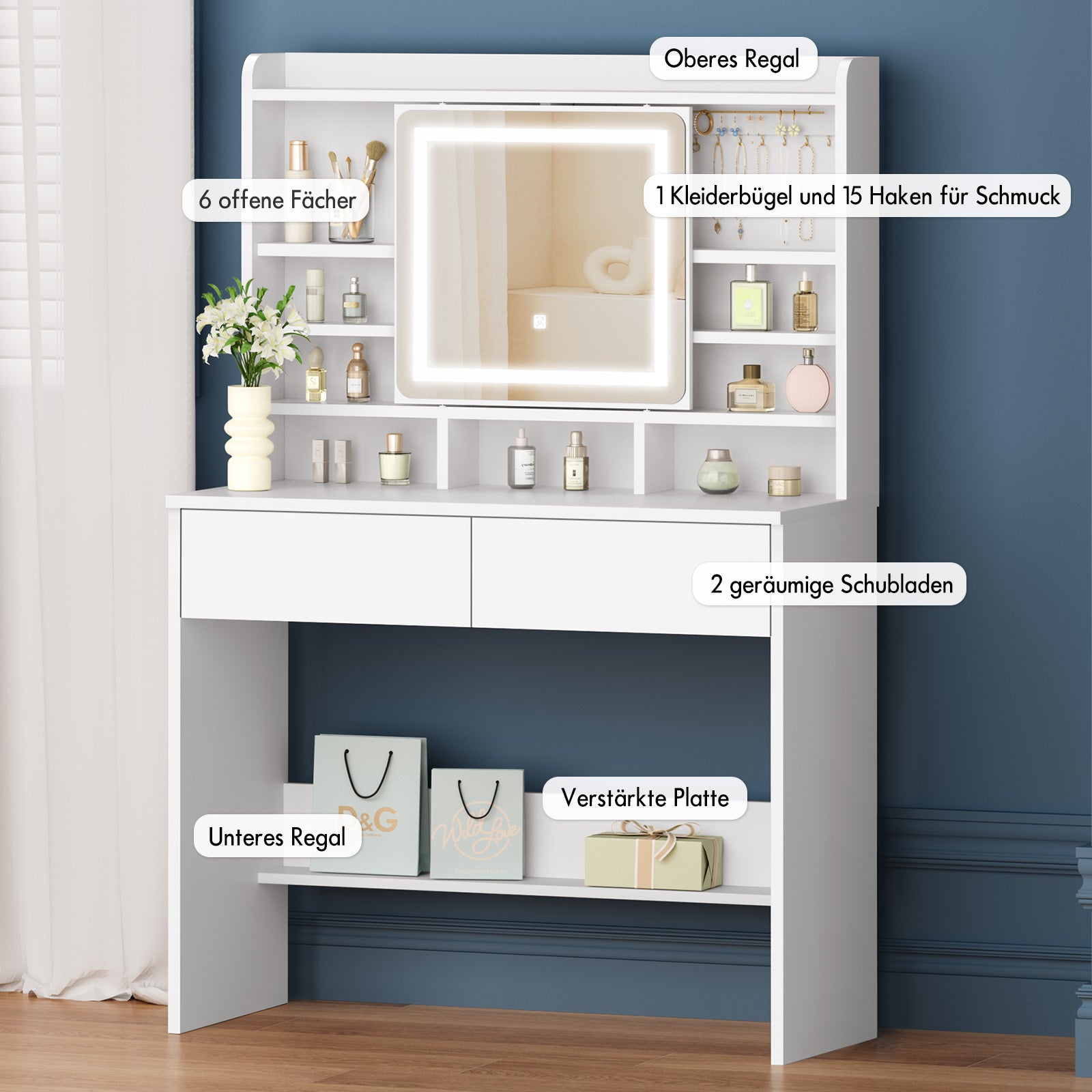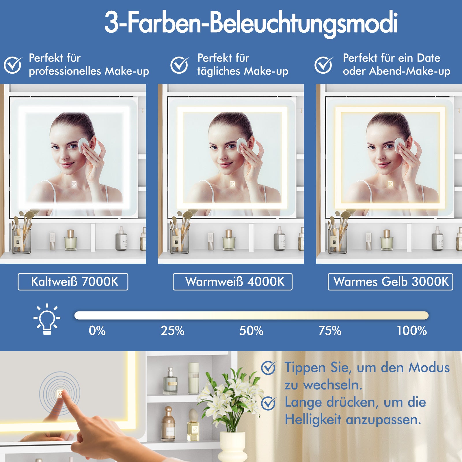 * Geräumige Tischplatte für reichlich Stauraum * 4 Schubladen, 1 offenes Regal * 3 Lichtfarben: Kaltweiß, Warmweiß und Warmgelb * Mit Spiegel * Passender gepolsterter Hocker * Stabile KonstruktionSpezifikationen