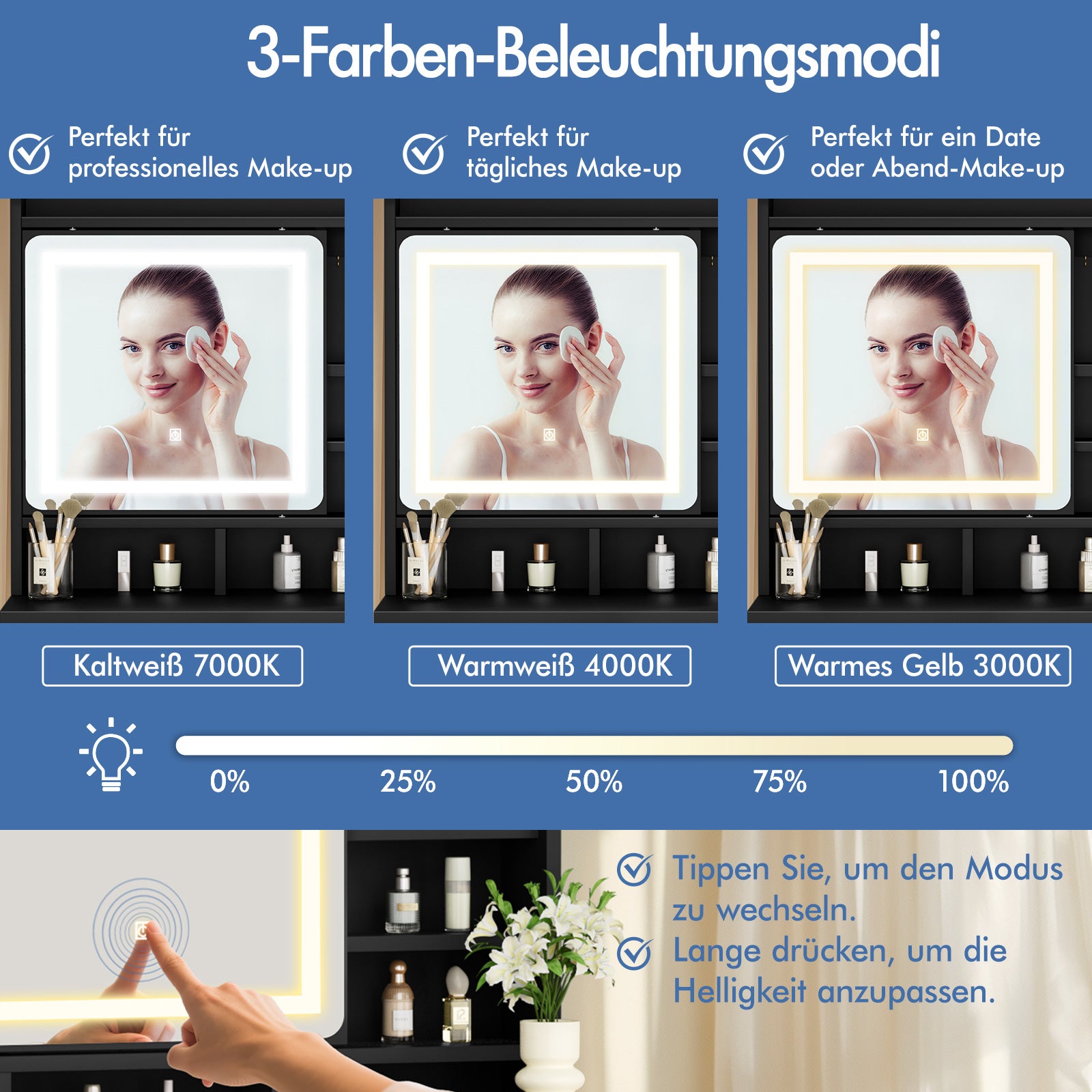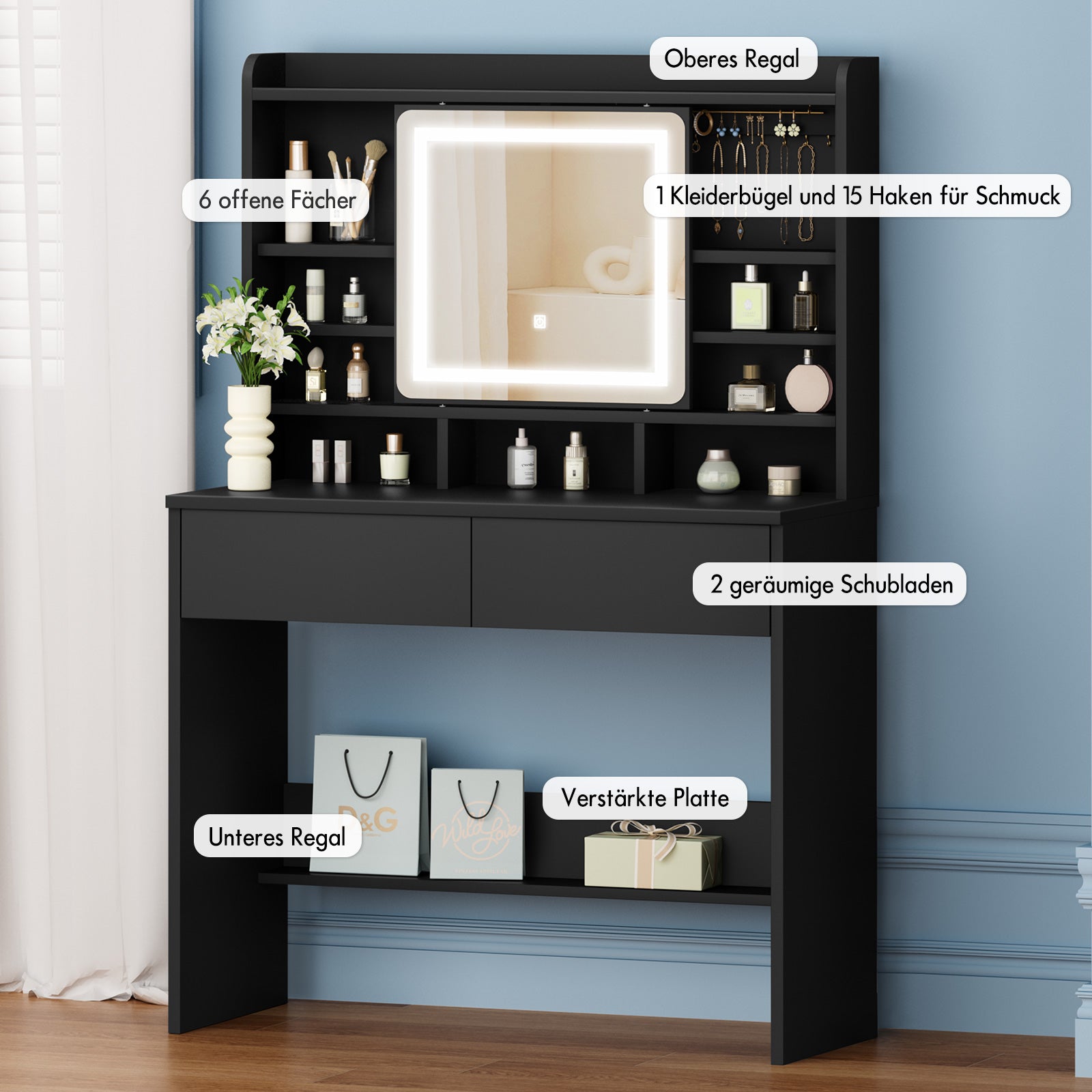 * Geräumige Tischplatte für reichlich Stauraum * 4 Schubladen, 1 offenes Regal * 3 Lichtfarben: Kaltweiß, Warmweiß und Warmgelb * Mit Spiegel * Passender gepolsterter Hocker * Stabile Konstruktion