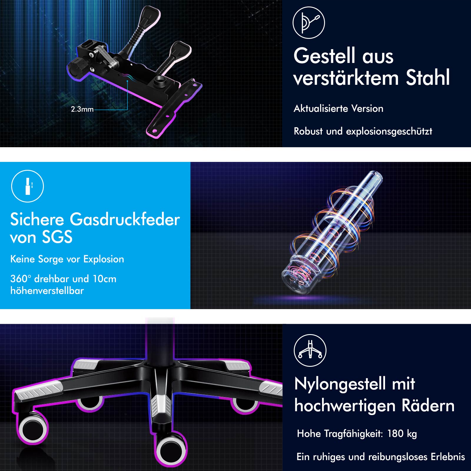 * Intelligenter Gaming-Stuhl * Robuster Rennstuhl mit Ganzmetallrahmen * S-Kurven-Design, optimale Passform für Ihren Körper * Abnehmbare und höhenverstellbare Kopf- und Lendenwirbelpolster* Extra großes Lendenwirbelkissen für bessere Unterstützung!* Keine Kompromisse bei den Materialien, wir verwenden keinen recycelten Schaumstoff* Großzügige Schaumstoffpolsterung, wir schneiden sie nicht zu dünn, um Geld zu sparen * Bis zu 150 Grad Neigungsverstellung der Rückenlehne * Möglichkeit zur Arretierung der Liegeposition * Breiter und breiter höhere Rückenlehne, wir schneiden sie nicht ab, um Kosten zu sparen* Einziehbare, gepolsterte Fußstütze* Hochwertige Universalräder, ein reibungsloses Erlebnis * Deluxe-Neigungsverstellung * Durchgehender Formschaum, bessere Gewichtsverteilung und Unterstützung* Sanfte 360-Grad-Drehung * Deluxe-Armlehnen aus PP-Kunststoff mit Polsterung, breit und stützend * Hochelastischer Schaumstoff in Autositzqualität * Eliminiert Rücken- und Schulterdruck * Sportliche Nylonbasis mit einem Hauch von Farbe * Ideal für Gamer und geschäftliche Zwecke