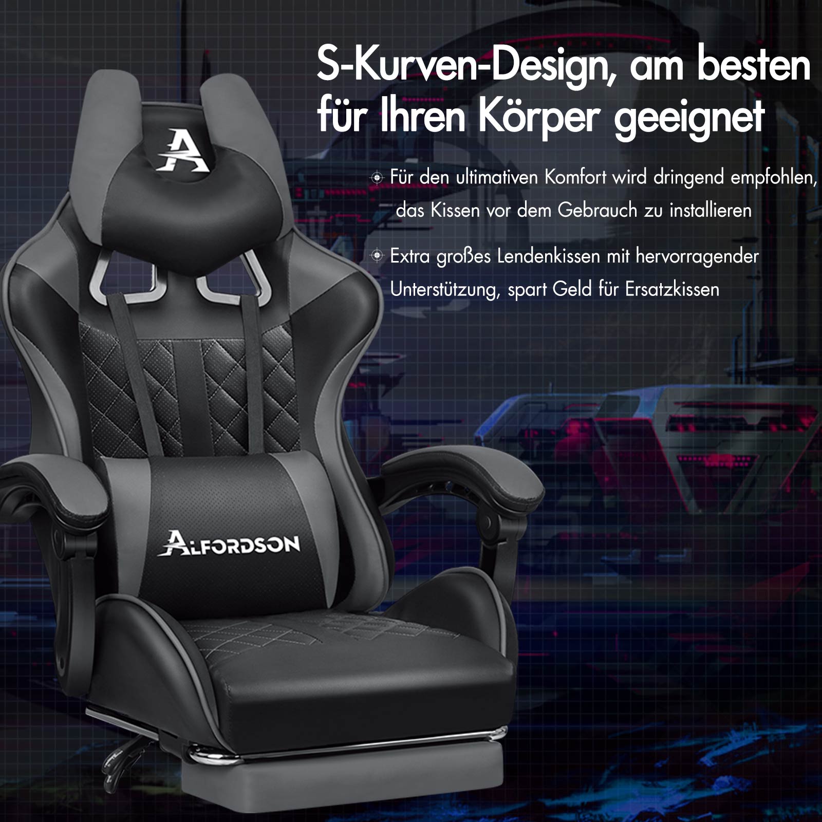 ALFORDSON Gaming Stuhl Office Racer Großes Lendenkissen Fußstütze Sitz Leder Grau