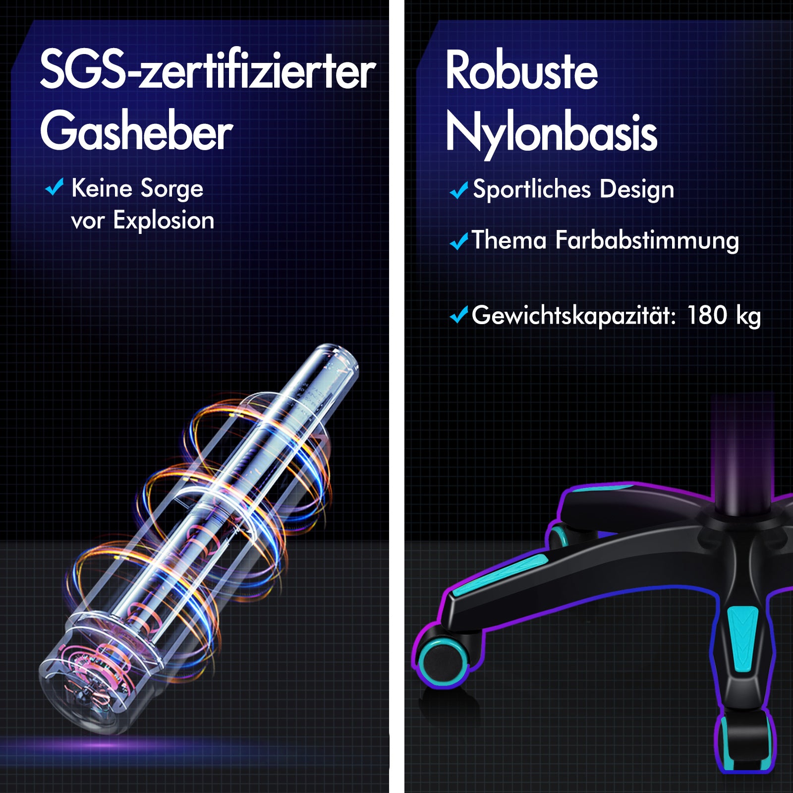 * Anpassbares 12-Farben-RGB-LED-Licht* Sie können den Lichtaustrittsbereich individuell anpassen: nur Rückenlehne oder Rückenlehne und Sitz* 300 Lichteffekte mit Fernbedienung* 8-Punkt-Massage und 5 Massagemodi mit Massageregler* Verbesserte Gleitschienenarmlehnen* Robuster Rennwagen mit robuster Holzrahmen * Dynamisches ergonomisches Design, beste Passform für Ihren Körper * Abnehmbare und höhenverstellbare Kopf- und Lendenkissen* Extra großes Lendenkissen für besseren Halt!* Keine Kompromisse bei den Materialien, wir verwenden keinen recycelten Schaumstoff* Großzügige Schaumstoffpolsterung, wir schneiden es nicht dünn, um Geld zu sparen * Bis zu 150° Rückenneigungsverstellung * Kann die Liegeposition arretiert werden * Breitere und höhere Rückenlehne, wir kürzen sie nicht, um Kosten zu sparen* Ausziehbare, gepolsterte Fußstütze* Premium-Universalräder, ein reibungsloses Erlebnis * Deluxe-Neigungsverstellung * Ganzteiliger Formschaum, bessere Gewichtsverteilung und Unterstützung* Reibungslos um 360° schwenkbar * Deluxe-Armlehnen aus PP-Kunststoff mit Polsterung, breit und stützend * Hochelastischer Schaumstoff in Autositzqualität * Beseitigt Rücken- und Schulterdruck * Sportliche Nylonbasis mit einem Hauch passender Farbe * Funktioniert als idealer Gaming Stühle und Bürostuhl