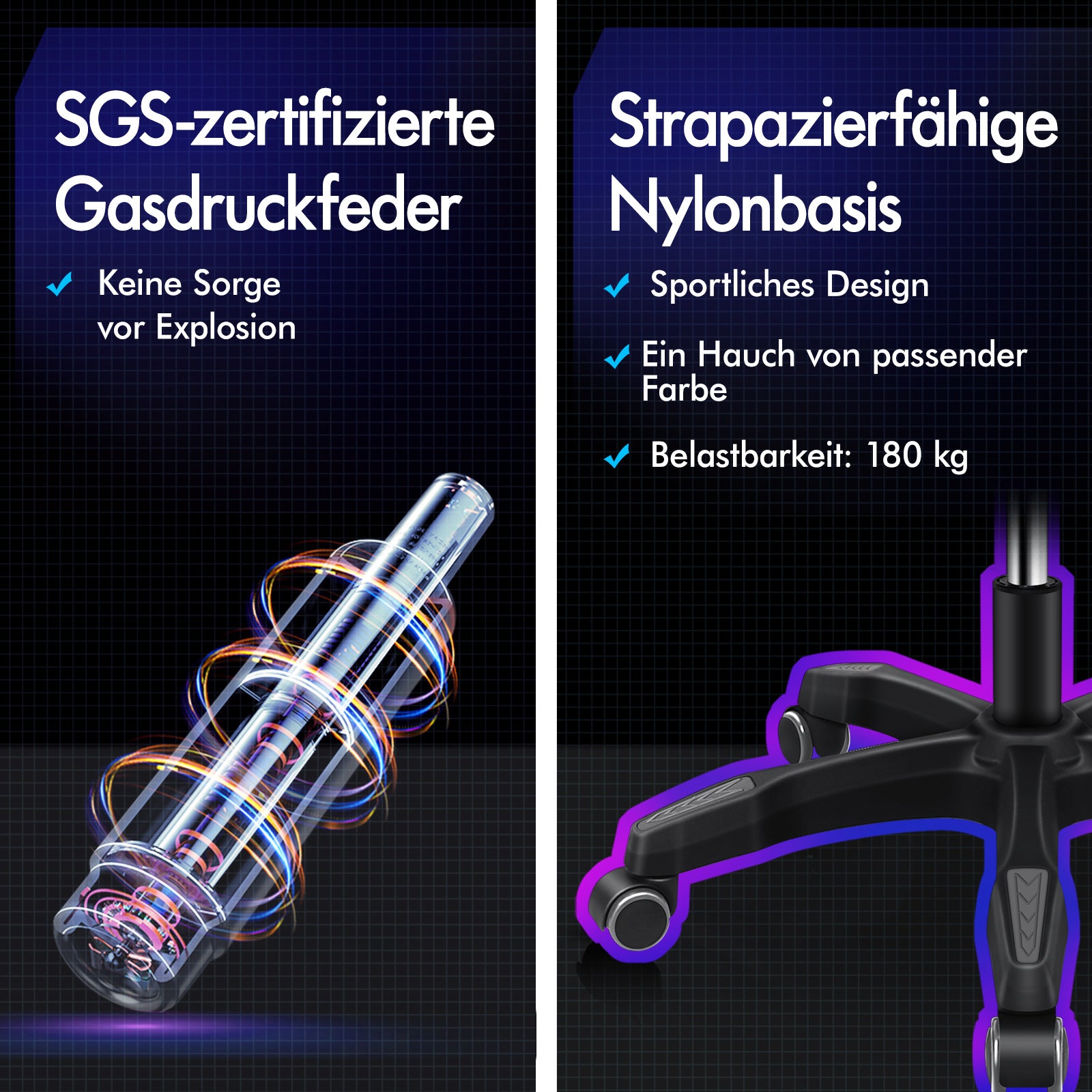 * Dynamisches ergonomisches Design, beste Passform für Ihren Körper * Breiter& Höhere Rückenlehne, wir kürzen sie nicht, um Kosten zu sparen * Verbessertes Lendenkissen mit Massagefunktion! * 2-Punkt-Massage & 5 Massagemodi * Verbesserte Armlehnen mit Gleitschienen * Deluxe-Armlehnen aus PP-Kunststoff mit Polsterung, breit und stützend * Abnehmbarer und höhenverstellbarer Kopf & Lendenkissen * Großzügige Schaumstoffpolsterung, wir machen es nicht dünn, um Geld zu sparen * Hochelastischer Schaumstoff in Autositzqualität * Ganzteiliger Formschaum, bessere Gewichtsverteilung und Unterstützung * Keine Kompromisse bei den Materialien, wir verwenden keinen recycelten Schaumstoff * Beseitigt Rücken- und Schulterdruck * Bis zu 150 Grad verstellbare Rückenlehne * Kann die Liegeposition arretiert werden * Ausziehbare, gepolsterte Fußstütze * Deluxe-Neigungsverstellung * Reibungslos um 360 Grad drehbar * Premium-Universalräder, ein reibungsloses Erlebnis * Sportliche Nylonbasis mit einem Hauch passender Farbe * Ideal für Gamer und geschäftliche Zwecke
