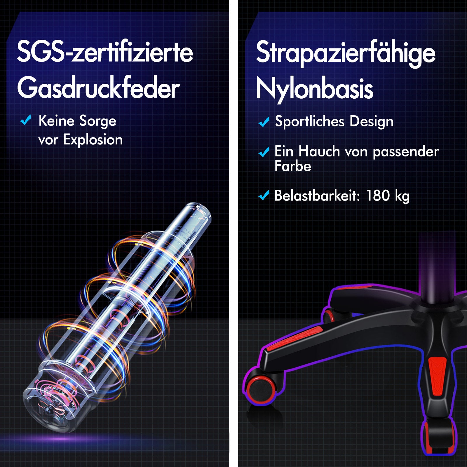 Spezifikationen * Von Intertek zugelassenes, hochwertiges PU-Leder * SGS-zugelassener Gaslift, keine Angst vor Explosion * TÜV-geprüfte Lenkräder * Dreischichtiger Sitz: PU-Leder + elastischer Schaumstoff + robustes Holzbrett * Hohe Tragfähigkeit: 180 kg * 2 Jahr Garantie* Farbe: Rot & Schwarz