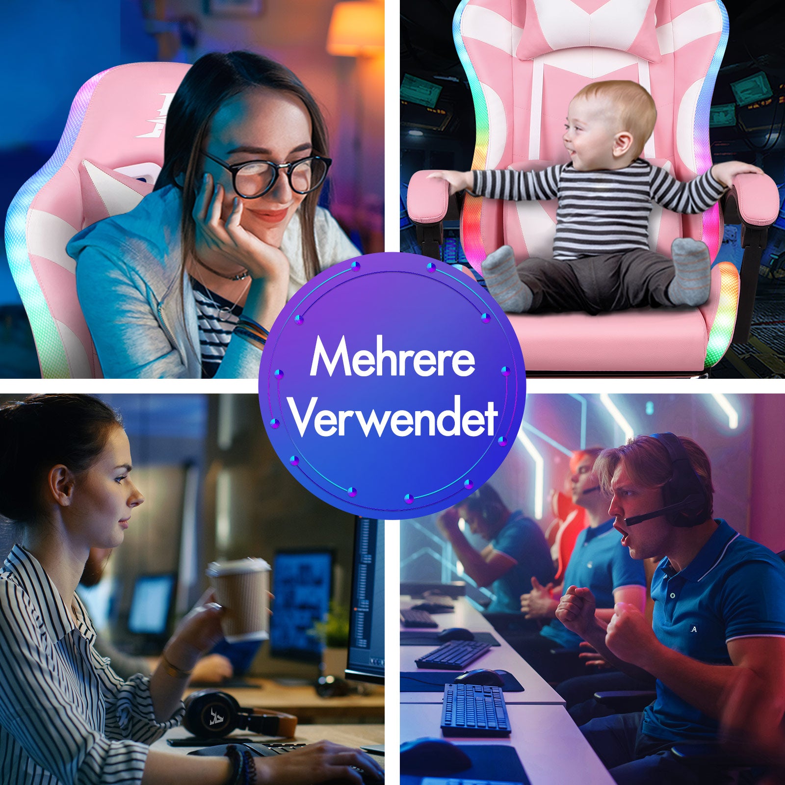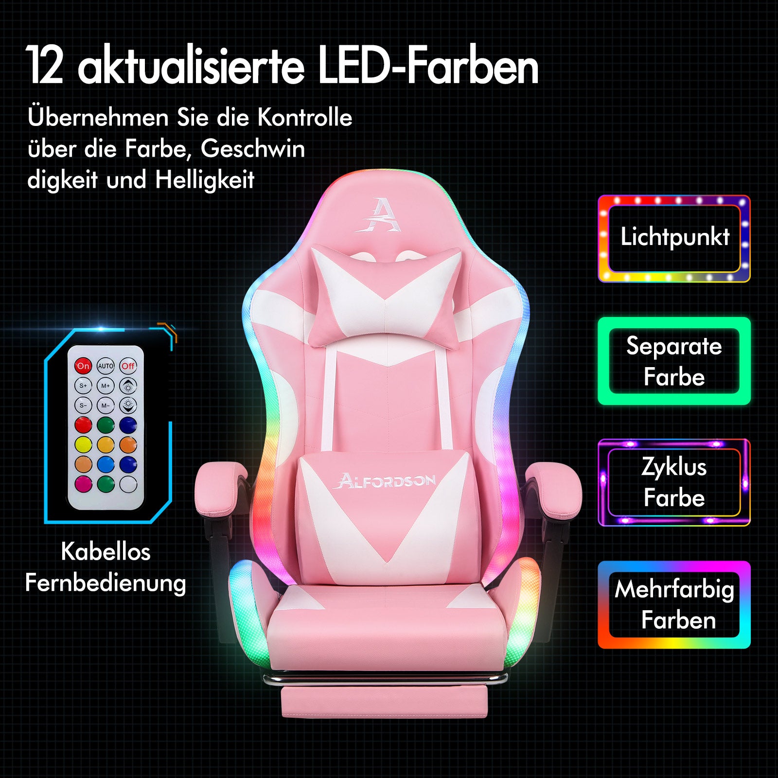 * Innovative RGB-LED-Lichteffekte mit Fernbedienung * Über 300 Beleuchtungsmodi * 12 LED-Farben, 10-stufige Lichtgeschwindigkeitsregelung und 32-stufige Helligkeitsregelung * Dynamisches, ergonomisches Design für optimale Körperanpassung * 8-Punkt-Massage und 5 Massage-Vibrationsmodi mit Massagesteuerung * Entlastet Rücken, Lendenwirbel und Oberschenkel * Rückenlehnenverstellung bis zu 150 Grad, arretierbar * Abnehmbare und höhenverstellbare Kopf- und Lendenwirbelkissen * Extra großes Lendenwirbelkissen für besseren Halt! * Großzügige Polsterung mit formbarem Schaumstoff aus einem Stück * Bessere Gewichtsverteilung und Unterstützung * Einziehbare, gepolsterte Fußstütze * Hochwertige Universalräder, glatt und bodenschonend * Sanfte 360-Grad-Drehung * Luxuriöse Armlehnen aus PP-Kunststoff mit Polsterung, breit und stützend * Stabiler Chromfuß â€?wird weniger schmutzig als Kunststofffüße * Ideal für Gamer, Homeoffice und geschäftliche Zwecke