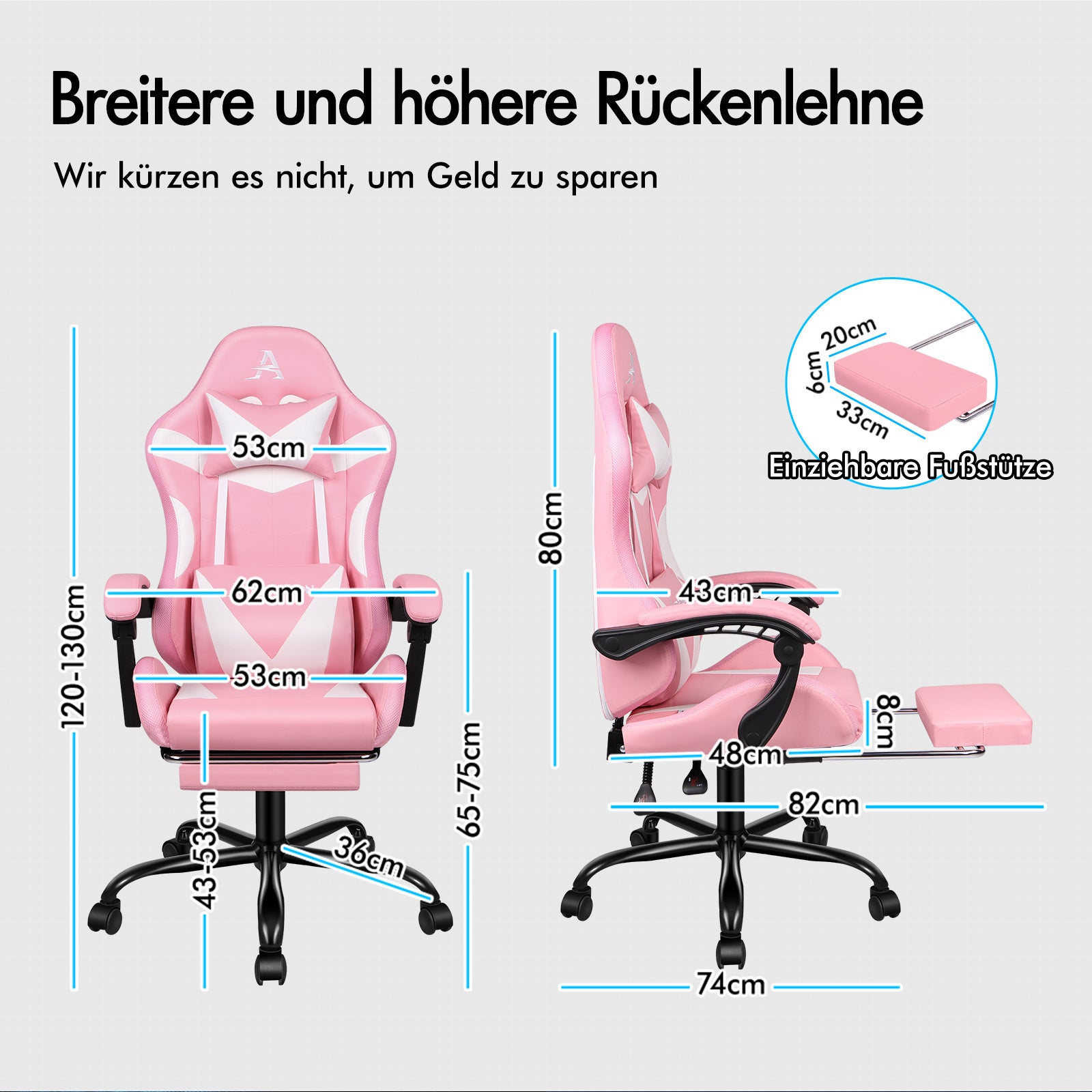 Spezifikationen * Dreischichtiger Sitz: Hochwertiges PU-Leder, hochelastischer Schaumstoff, robuste Holzplatte * Basismaterial: Schwarz pulverbeschichtetes Chrom * Robuste BIFMA-zertifizierte und Intertek-zugelassene Materialien * SGS-zugelassene Gasdruckfeder * TÜV-zugelassene Lenkrollen * Gewichtskapazität: 180 kg * Garantie: 2 Jahre * Farbe: Weiß und Pink * Abmessungen: 74 x 74 x 120~130 cm * Detaillierte Größen finden Sie auf dem Maßfoto
