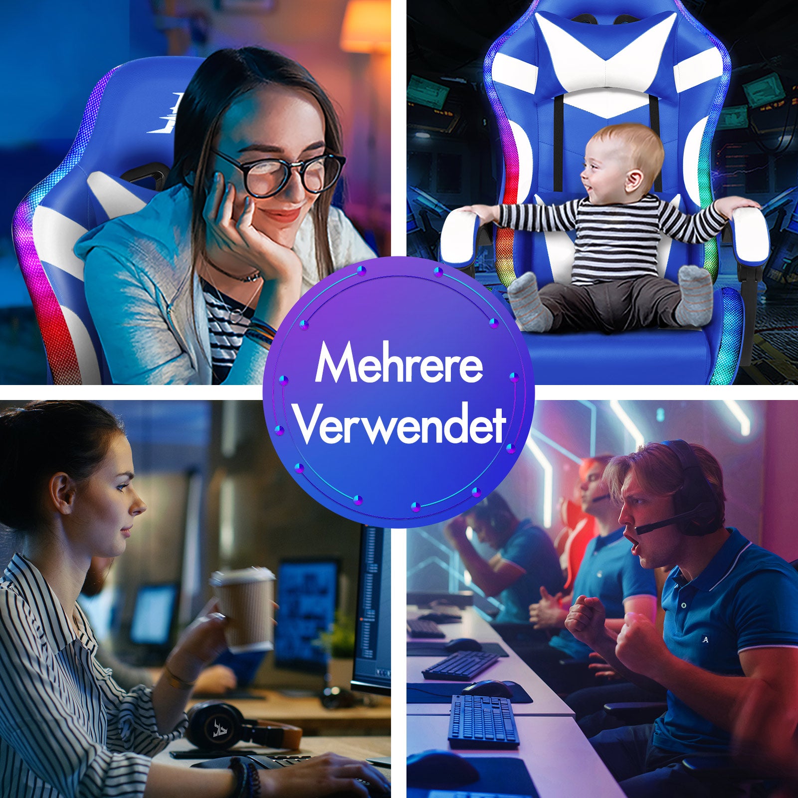 * Innovative RGB-LED-Lichteffekte mit Fernbedienung * Über 300 Beleuchtungsmodi * 12 LED-Farben, 10-stufige Lichtgeschwindigkeitsregelung und 32-stufige Helligkeitsregelung * Dynamisches, ergonomisches Design für optimale Körperanpassung * 8-Punkt-Massage und 5 Massage-Vibrationsmodi mit Massagesteuerung * Entlastet Rücken, Lendenwirbel und Oberschenkel * Rückenlehnenverstellung bis zu 150 Grad, arretierbar * Abnehmbare und höhenverstellbare Kopf- und Lendenwirbelkissen * Extra großes Lendenwirbelkissen für besseren Halt! * Großzügige Polsterung mit formbarem Schaumstoff aus einem Stück * Bessere Gewichtsverteilung und Unterstützung * Einziehbare, gepolsterte Fußstütze * Hochwertige Universalräder, glatt und bodenschonend * Sanfte 360-Grad-Drehung * Luxuriöse Armlehnen aus PP-Kunststoff mit Polsterung, breit und stützend * Stabiler Chromfuß â€?wird weniger schmutzig als Kunststofffüße * Ideal für Gamer, Homeoffice und geschäftliche Zwecke