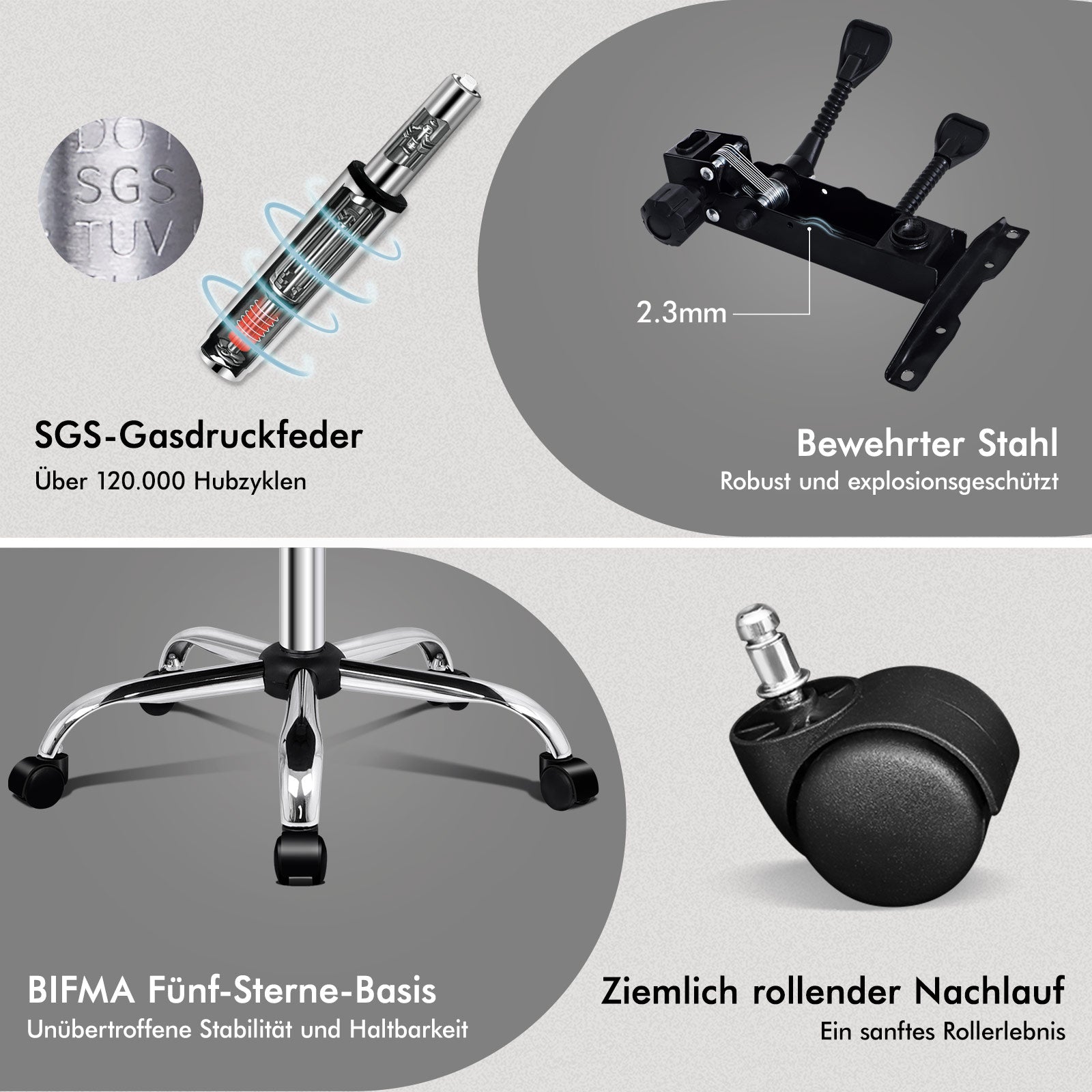 Spezifikationen * Von Intertek zugelassenes, hochwertiges PU-Leder/Leinenstoff * SGS-zugelassener Gaslift, keine Angst vor Explosion * TÜV-geprüfte Lenkräder * Dreischichtiger Sitz: PU-Leder/Atmungsaktives Leinengewebe + elastischer Schaumstoff + robustes Holzbrett * Hohe Tragfähigkeit: 180 kg * 1 Jahr Garantie * Farbe: Schwarz / Weiß / Braun / Grau / Stoff Grau/ Stoff Schwarz