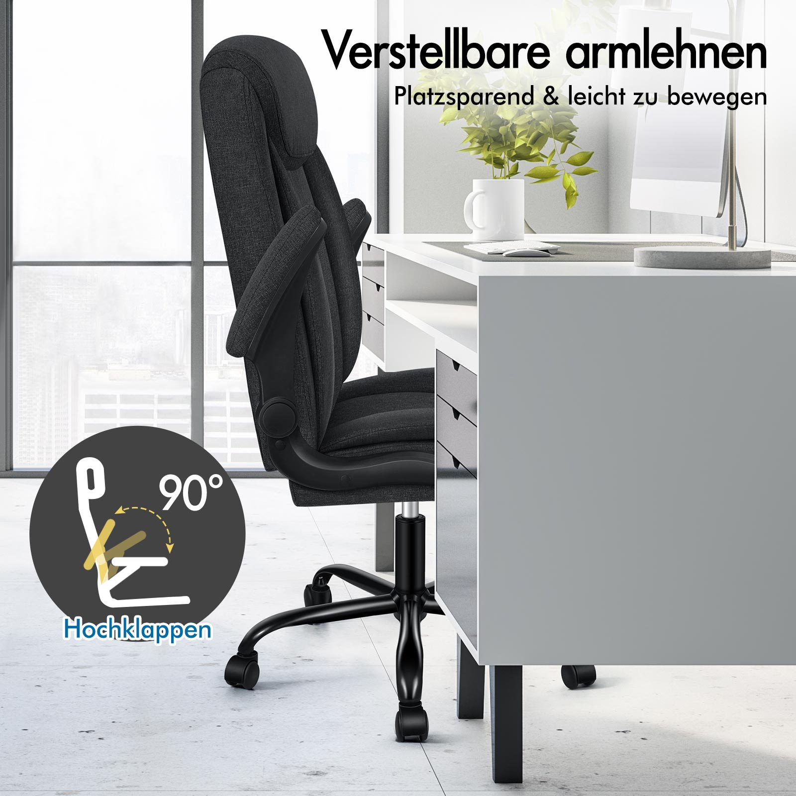 Mit den hochklappbaren Armlehnen können Sie Ihre Sitzposition ganz einfach anpassen oder den Stuhl näher an Ihren Schreibtisch oder Arbeitsplatz rücken, ohne dass die Armlehnen im Weg sind.