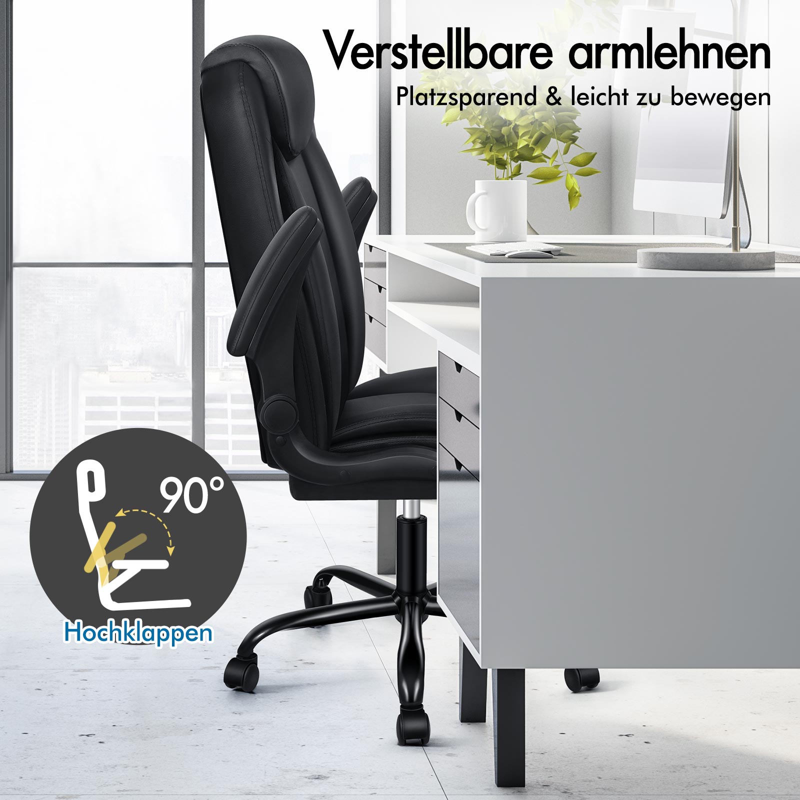 Funktionen* Luxuriöses PU-Leder und schickes Design verleihen Ihrem Raum dauerhafte Eleganz* Die ergonomische S-förmige Rückenlehne passt sich der natürlichen Körperform an und bietet umfassenden Halt* Gepolsterter Sitz und hohe Rückenlehne mit 2 Massagepunkten lindern den Druck auf Kopf und Rücken und sorgen für ultimativen Komfort * Hochklappbare Armlehnen und leichtgängige 360°-Lenkrollen ermöglichen mühelose Bewegung und platzsparenden Komfort * Sitzkissen mit hochelastischem Schaumstoff für ganztägigen Komfort * Stabiler Rahmen mit Chrombasis* Flexible Neigungsverstellung * Keine Kompromisse bei der Qualität: Wir vermeiden recycelten Schaumstoff und sparen nie an der Polsterdicke, um Kosten zu senken * Ideal für den Einsatz zu Hause, im Büro und im Geschäft