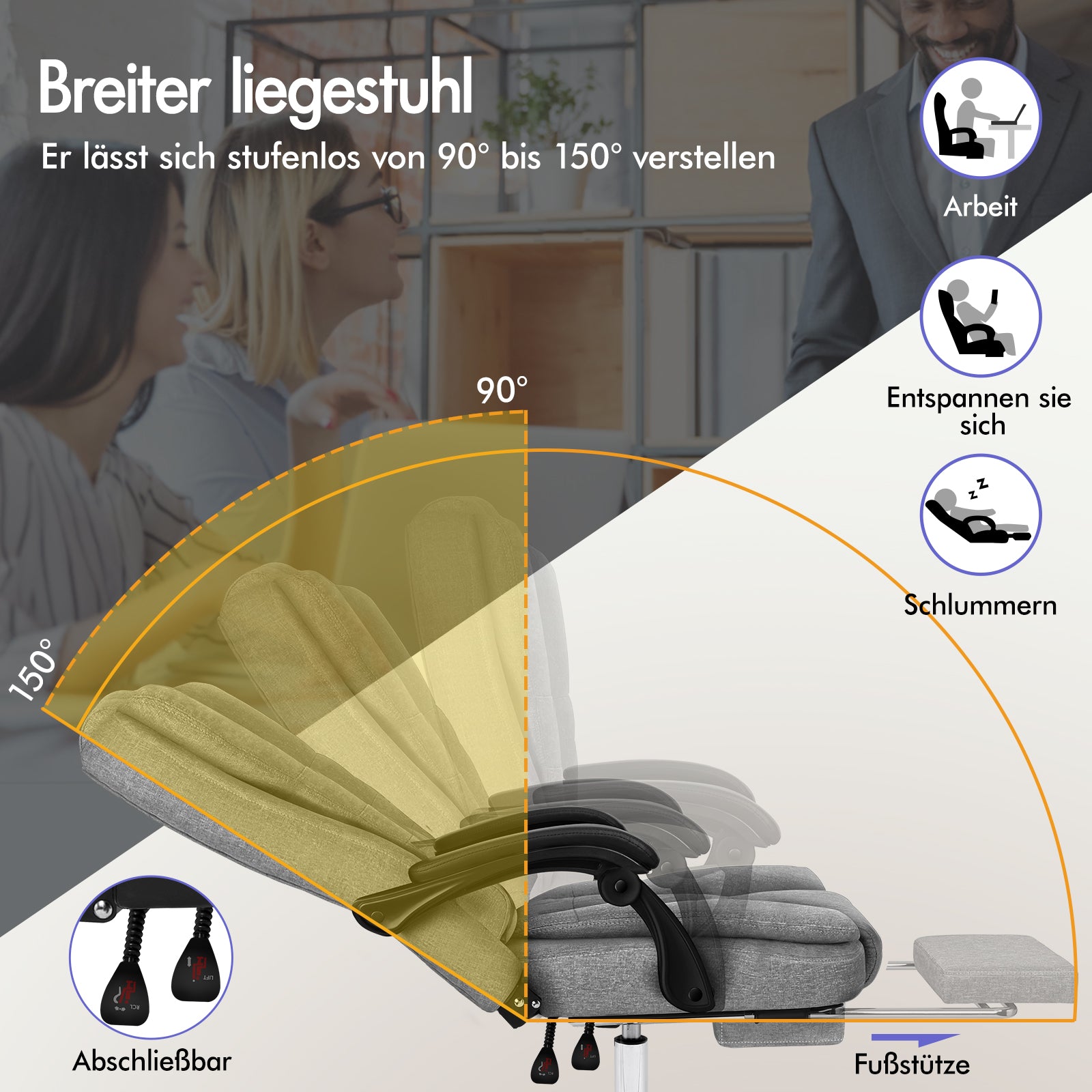 Er verfügt über ein stabiles Chromgestell mit bis zu 150 Grad verstellbarer Rückenlehne und 360-Grad-Drehung. Sie können die gewünschte Ruheposition arretieren. Die Polsterung aus luxuriösem Leinenstoff und die großzügige Schaumstoffpolsterung sorgen für optimale Haltbarkeit und Atmungsaktivität.