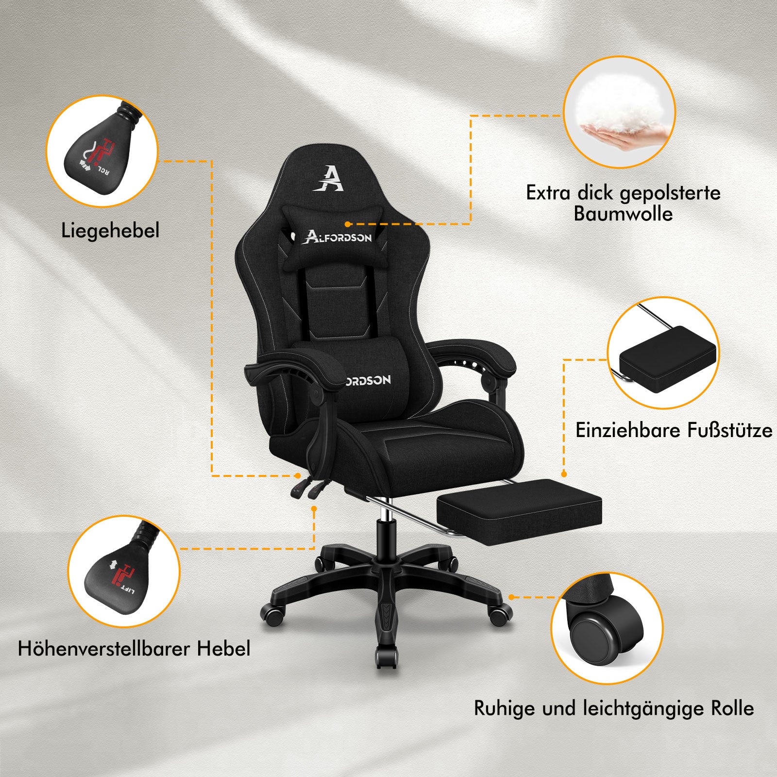 Die Alfordson®-Reihe ist in verschiedenen Farben und Designs erhältlich. Stöbern Sie in unserem Shop und finden Sie den Stuhl, der am besten zu Ihnen oder Ihrem Raum passt. Entlasten Sie die Arbeit und erleben Sie höchsten Komfort an Ihrem Schreibtisch – bestellen Sie noch heute Ihren Alfordson® Gaming-Bürostuhl!