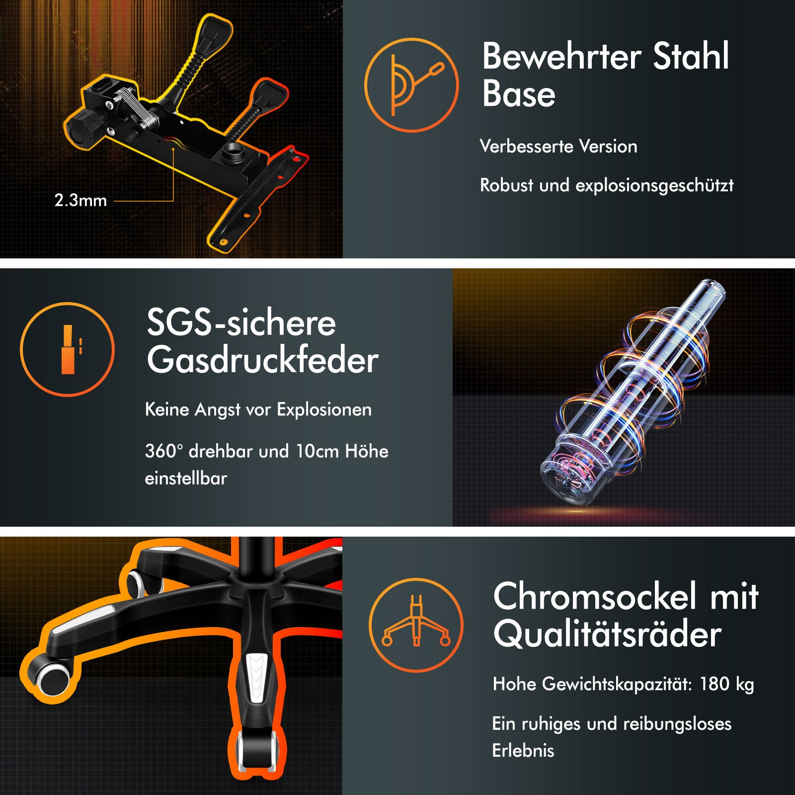 Ultimative Entspannung und praktische Unterstützung – Mit Blick auf Innovation haben wir den Gaming-Stuhl mit zwei Massagepunkten ausgestattet, die das Gaming-Erlebnis komfortabler und angenehmer machen. Das ergonomische S-Kurven-Design mit abnehmbaren und höhenverstellbaren Lenden- und Nackenkissen bietet perfekten Halt für entspanntes Arbeiten oder Spielen – für langes Arbeiten oder Spielen in Höchstform und optimalem Komfort.