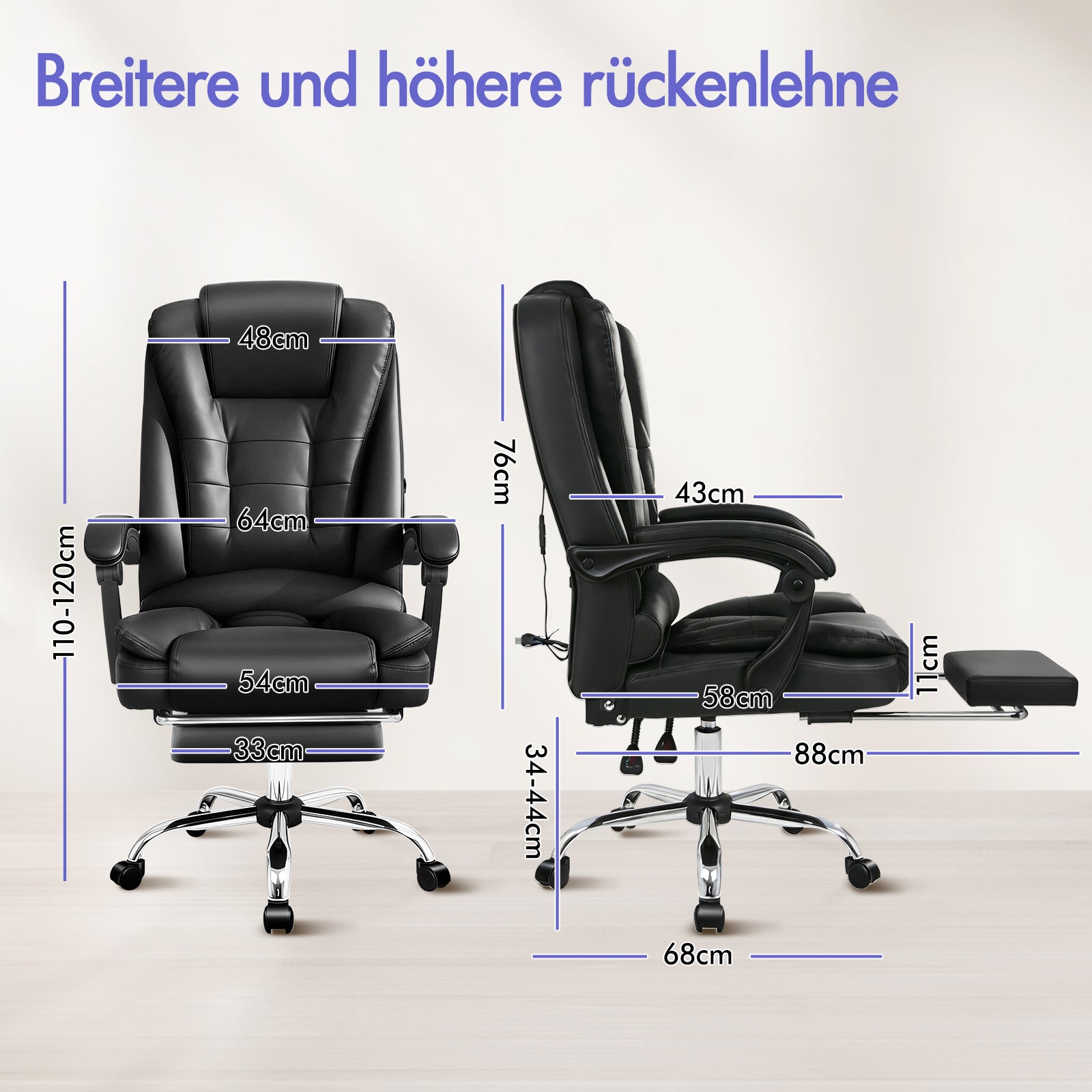 * Massage-Bürostuhl mit exklusivem Komfort* 5 Massagemodi für die Lendenwirbelsäule * Verschiedene Massagekombinationen: Dauervibration Mischung aus intensiver und langsamer Vibration Kontinuierliche intensive Vibration * Verbessertes Modell mit großzügiger Polsterung * Ergonomische S-förmige Konstruktion zur vollständigen Anpassung an Ihre Körperform * Integrierte Lordosen- und Rückenstütze* Einziehbare, gepolsterte Fußstütze * Zweischichtiges Schmetterlingsdesign mit doppelt genähter Polsterung * Hochelastischer Schaumstoff * Bis zu 150 Grad verstellbare Rückenlehne * Arretierbare Liegeposition * Entlastet Rücken- und Schulterdruck * Luxuriöse Armlehnen mit Polsterung, breit und stützend * Hochglänzender Chromsockel, der nicht so leicht schmutzig wird wie ein Kunststoffsockel* Hochwertige Universalräder * Sanfte 360-Grad-Schwenkfunktion* Ideal für das Homeoffice und den geschäftlichen Einsatz