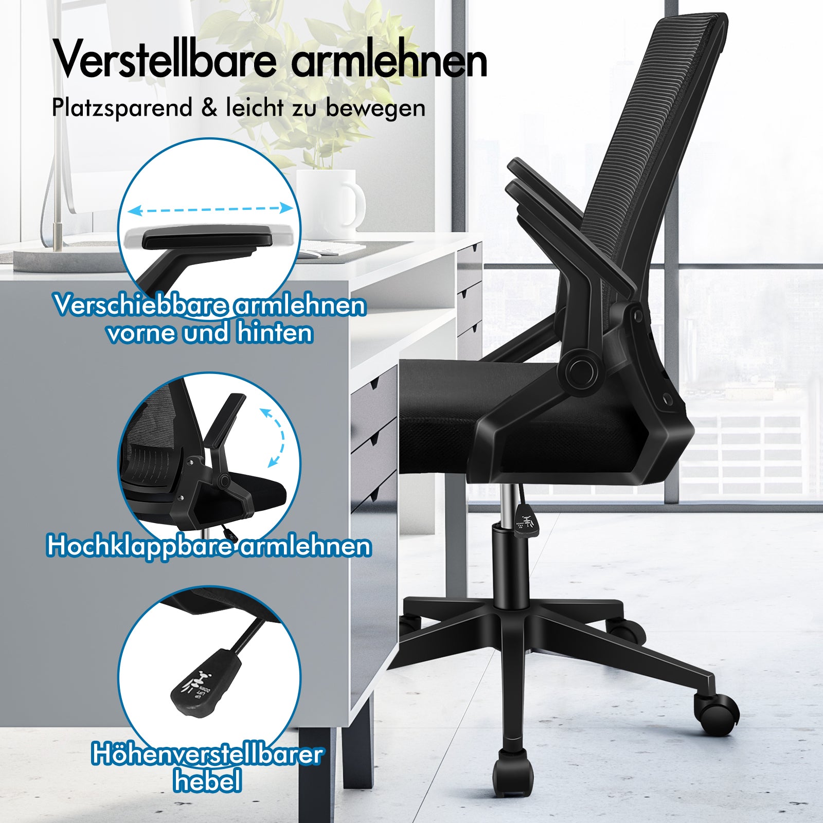 Spezifikationen * Intertek-geprüftes, hochwertiges Netzgewebe * SGS-geprüfte Gasdruckfeder, keine Explosionsgefahr * TÜV-geprüfte Lenkrollen * Dreischichtiger Sitz: Netzgewebe + elastischer Schaumstoff + Holzplatte * Hohe Gewichtskapazität: 180 kg * Garantie: 2 Jahre* Farbe:Schwarz* Abmessungen: 63 x 63 x 90~100 cm* Detaillierte Größenangaben finden Sie auf dem Maßfoto