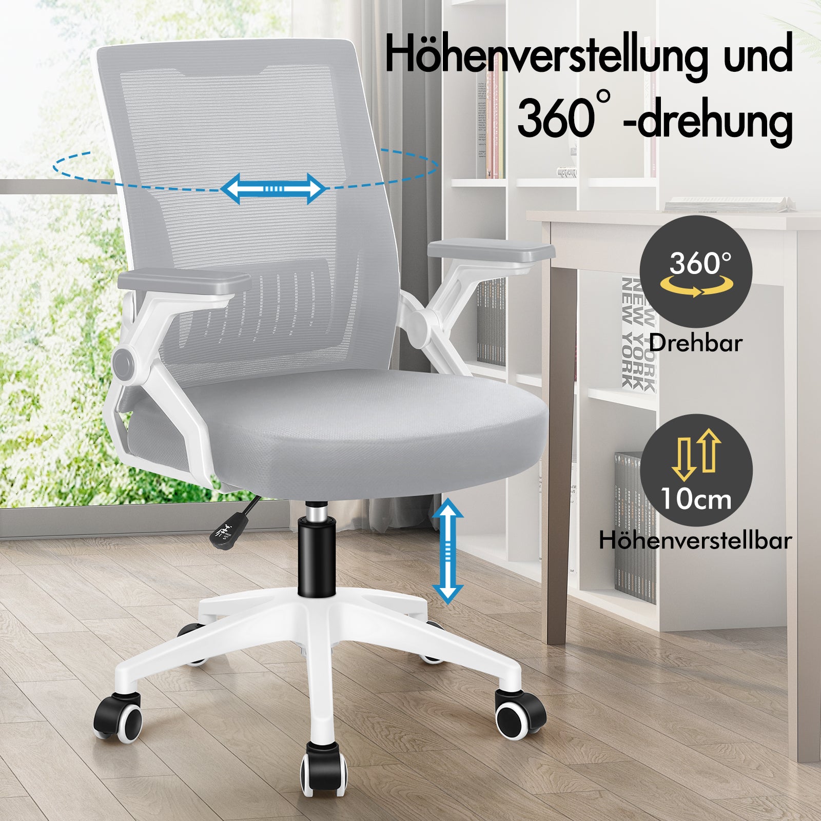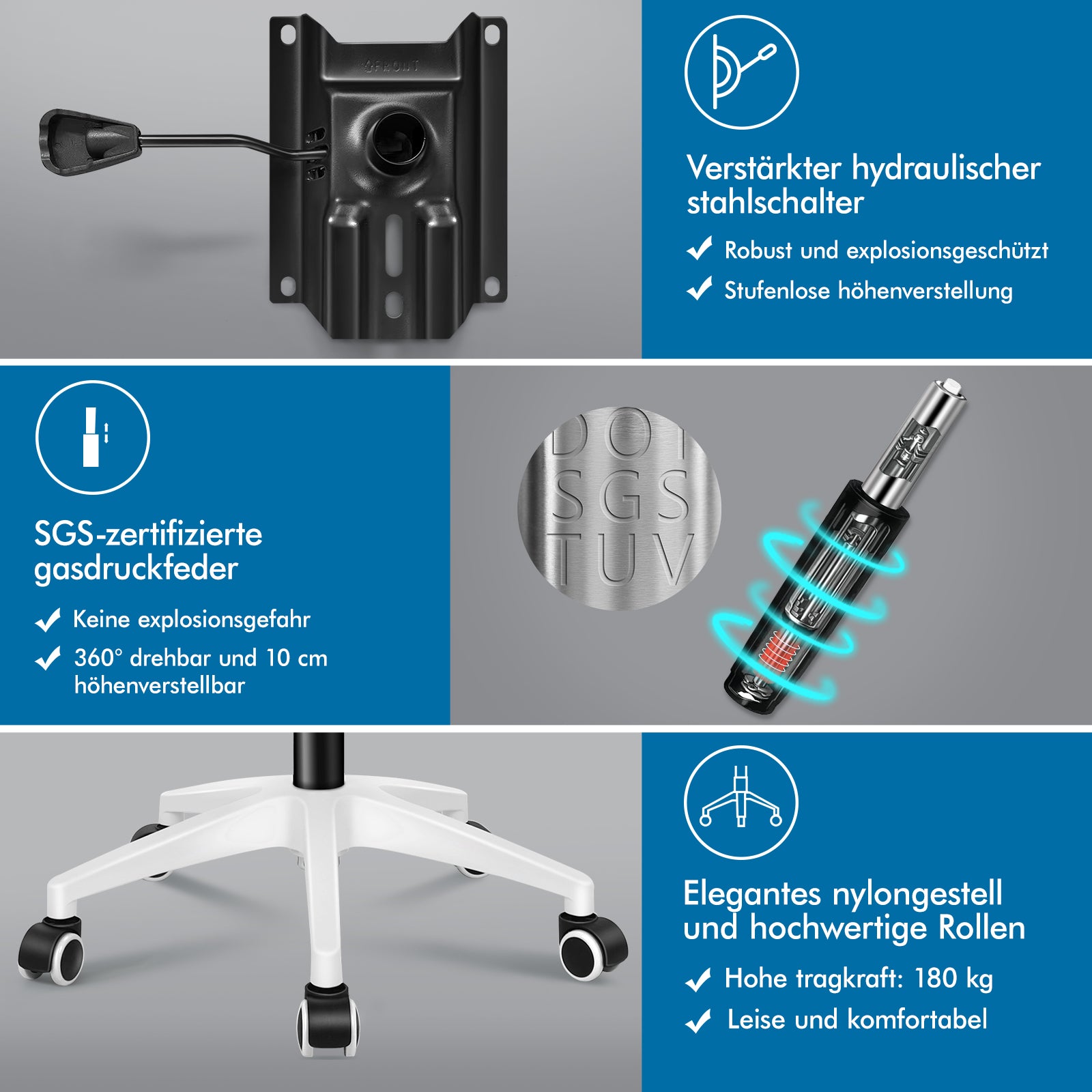 Spezifikationen * Intertek-geprüftes, hochwertiges Netzgewebe * SGS-geprüfte Gasdruckfeder, keine Explosionsgefahr * TÜV-geprüfte Lenkrollen * Dreischichtiger Sitz: Netzgewebe + elastischer Schaumstoff + Holzplatte * Hohe Gewichtskapazität: 180 kg * Garantie: 2 Jahre* Farbe: Weiß und Grau* Abmessungen: 63 x 63 x 90~100 cm* Detaillierte Größenangaben finden Sie auf dem Maßfoto