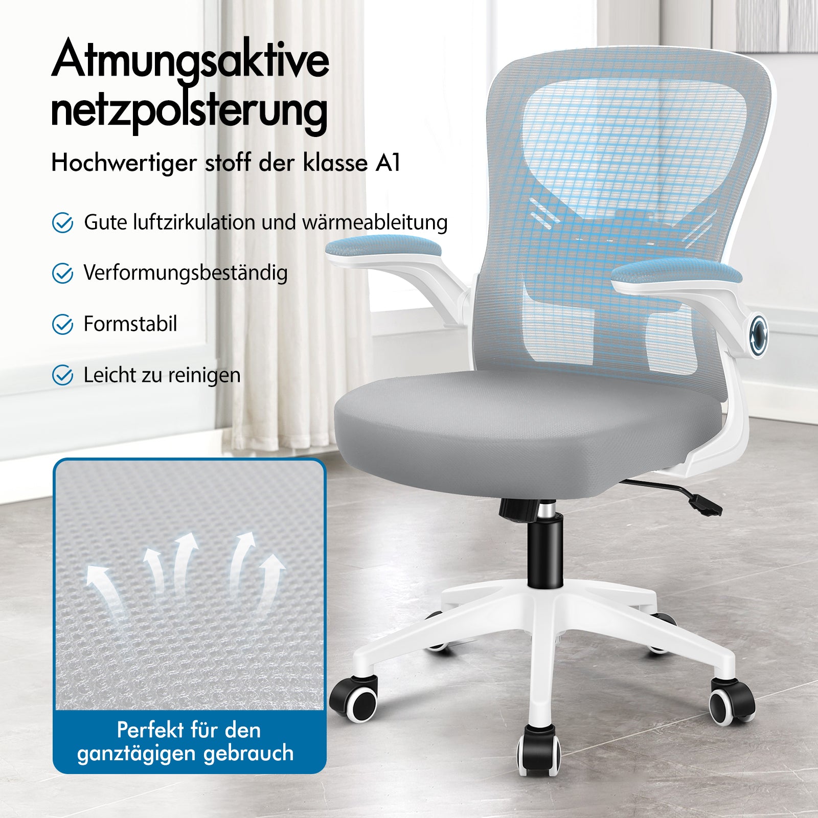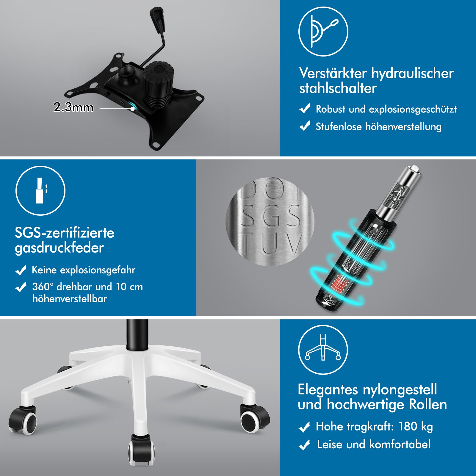 Spezifikationen * Intertek-geprüftes, hochwertiges Netzgewebe * SGS-geprüfte Gasdruckfeder, keine Explosionsgefahr * TÜV-geprüfte Lenkrollen * Dreischichtiger Sitz: Netzgewebe + elastischer Schaumstoff + Holzplatte * Hohe Gewichtskapazität: 180 kg * Garantie: 2 Jahre* Farbe: Weiß und Grau* Abmessungen: 63 x 63 x 94~104 cm* Detaillierte Größenangaben finden Sie auf dem Maßfoto