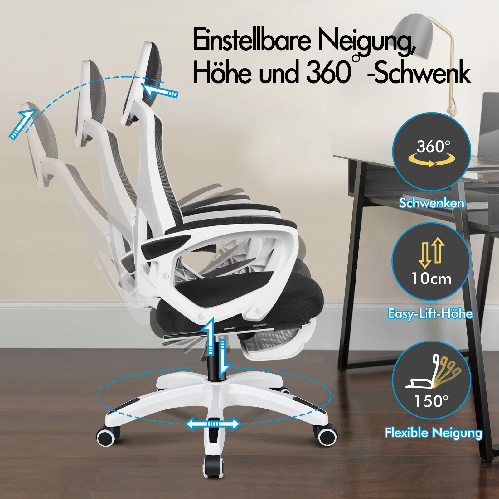 * Netzrückenlehne und Stoffsitzpolsterung, hoch atmungsaktiv * S-förmiges Design für optimale Körperanpassung * Integrierte, höhenverstellbare Lordosenstütze * Stilvolle Armlehnen mit Polsterung, breit und stützend * Großzügige Polsterung mit hochelastischem Schaumstoff * Entlastet Rücken und Schultern * 3-fach verstellbare Rückenlehne * Rückenlehnenneigung bis zu 150 Grad verstellbar * Ruheposition arretierbar * Flexible Neigungsverstellung * Breiter und höhere Rückenlehne, wir kürzen sie nicht, um Kosten zu sparen * Einziehbare, gepolsterte Fußstütze * Hochwertige Universalräder, ein reibungsloses Erlebnis * Nylonbasis in einzigartiger geschwungener Form * Sanfte 360-Grad-Drehung * Robuste Materialien aus Metall und Nylon * Ideal für das Homeoffice, Gamer und den geschäftlichen Einsatz