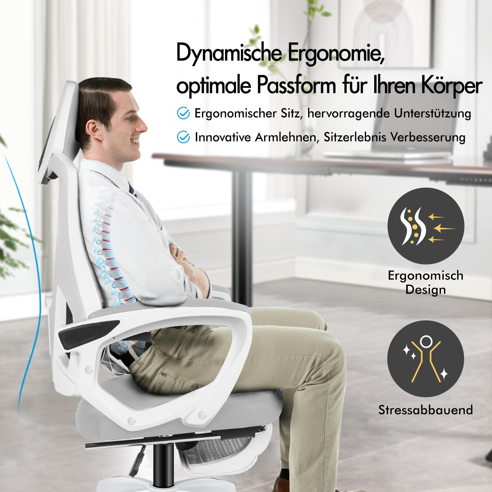 * Netzrückenlehne und Stoffsitzpolsterung, hoch atmungsaktiv * S-förmiges Design für optimale Körperanpassung * Integrierte, höhenverstellbare Lordosenstütze * Stilvolle Armlehnen mit Polsterung, breit und stützend * Großzügige Polsterung mit hochelastischem Schaumstoff * Entlastet Rücken und Schultern * 3-fach verstellbare Rückenlehne * Rückenlehnenneigung bis zu 150 Grad verstellbar * Ruheposition arretierbar * Flexible Neigungsverstellung * Breiter und höhere Rückenlehne, wir kürzen sie nicht, um Kosten zu sparen * Einziehbare, gepolsterte Fußstütze * Hochwertige Universalräder, ein reibungsloses Erlebnis * Nylonbasis in einzigartiger geschwungener Form * Sanfte 360-Grad-Drehung * Robuste Materialien aus Metall und Nylon * Ideal für das Homeoffice, Gamer und den geschäftlichen Einsatz