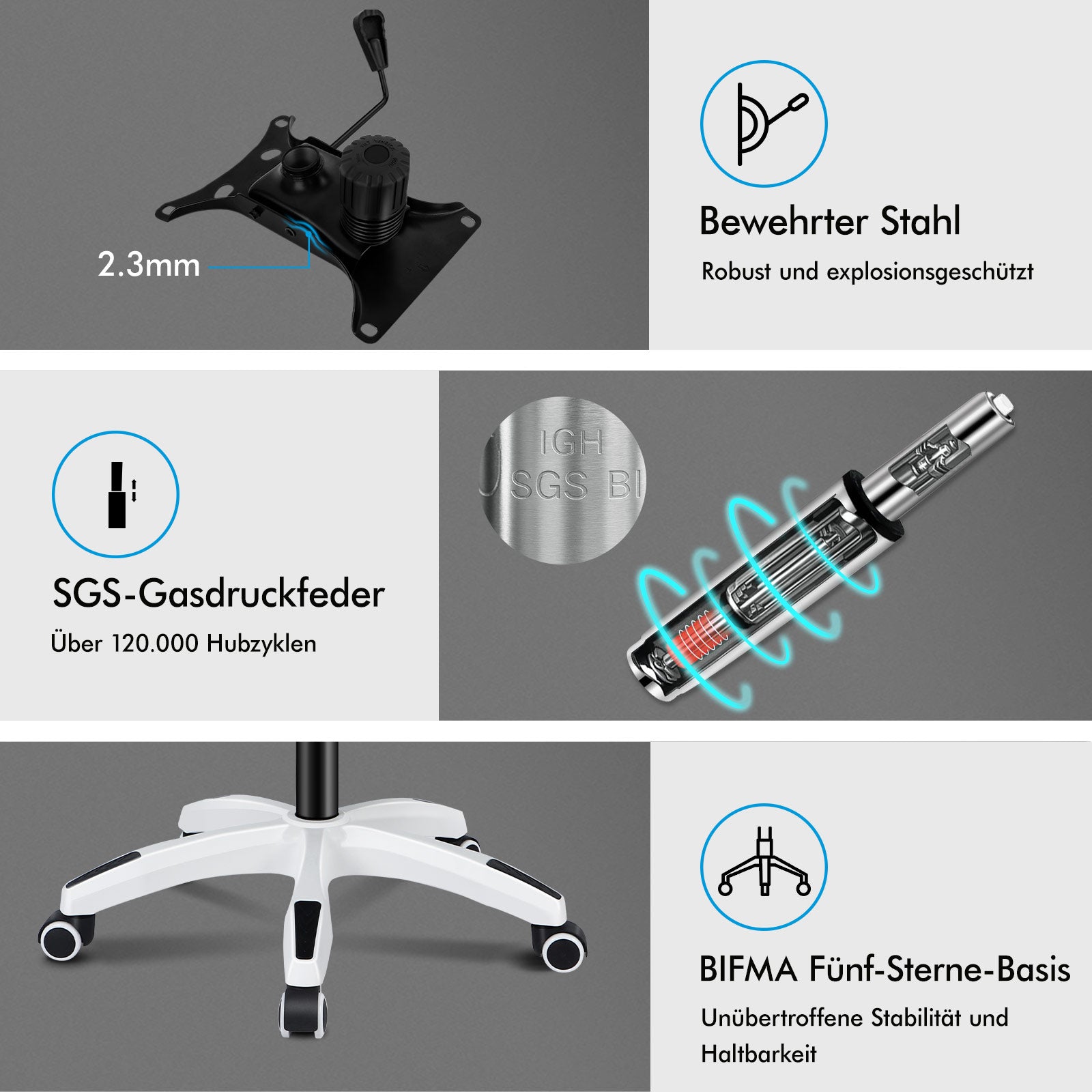 Spezifikationen* Intertek-geprüftes, hochwertiges Netzgewebe * SGS-geprüfte Gasdruckfeder, keine Explosionsgefahr * TÜV-geprüfte Lenkrollen * Dreischichtiger Sitz: Netzgewebe + elastischer Schaumstoff + Holzplatte * Hohe Gewichtskapazität: 180 kg * Garantie: 2 Jahre * Farbe: Weiß und Grau * Abmessungen: 68 x 68 x 119~129 cm * Detaillierte Größenangaben finden Sie auf dem Maßfoto