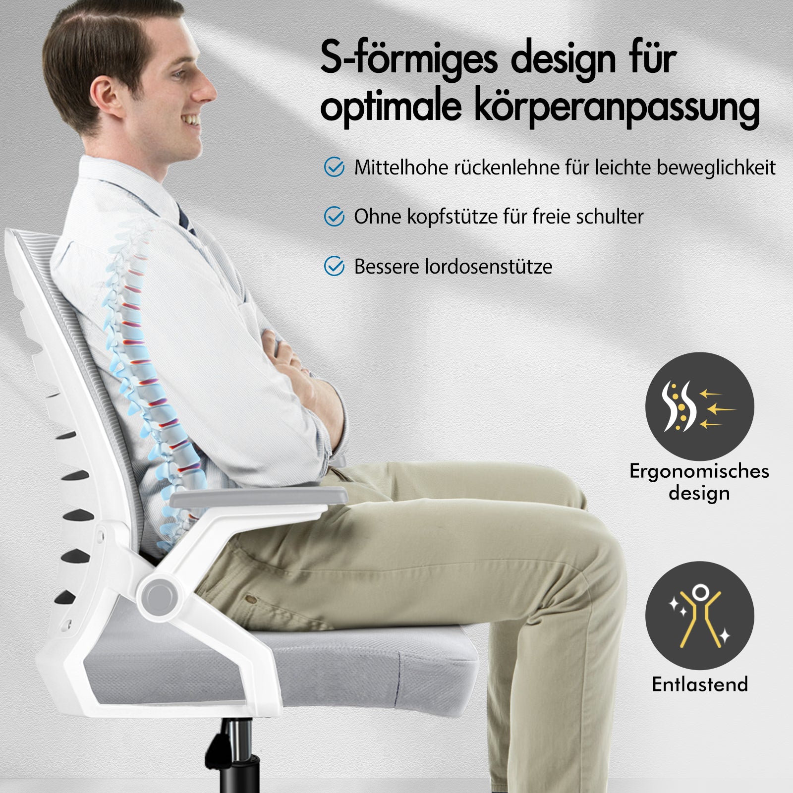 Dieser Computerstuhl verfügt über eine ergonomische S-Kurve ohne Kopfstütze für freie Schulterfreiheit und eine mittelhohe Rückenlehne für optimale Bewegungsfreiheit. Die hochwertige Netzpolsterung der Rückenlehne bietet optimalen Halt und beugt dem Durchhängen vor. Zusätzlich verfügt der Schreibtischstuhl über horizontal verstellbare und einziehbare Armlehnen, die sich ganz nach Wunsch unter Ihren Schreibtisch einfügen.